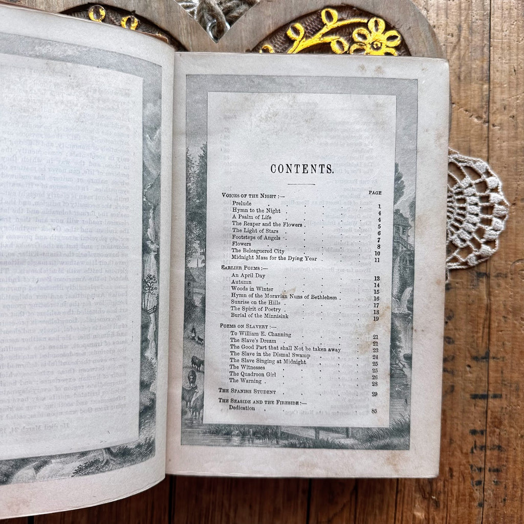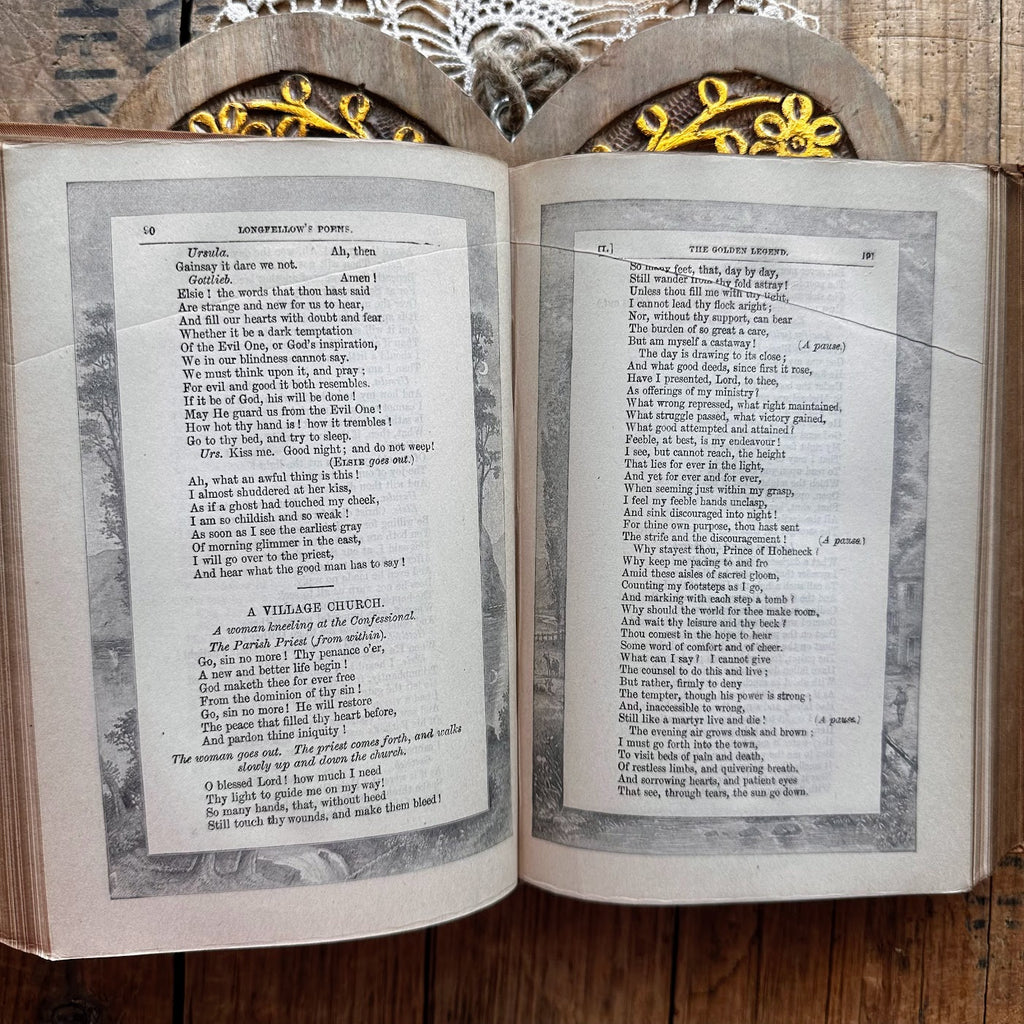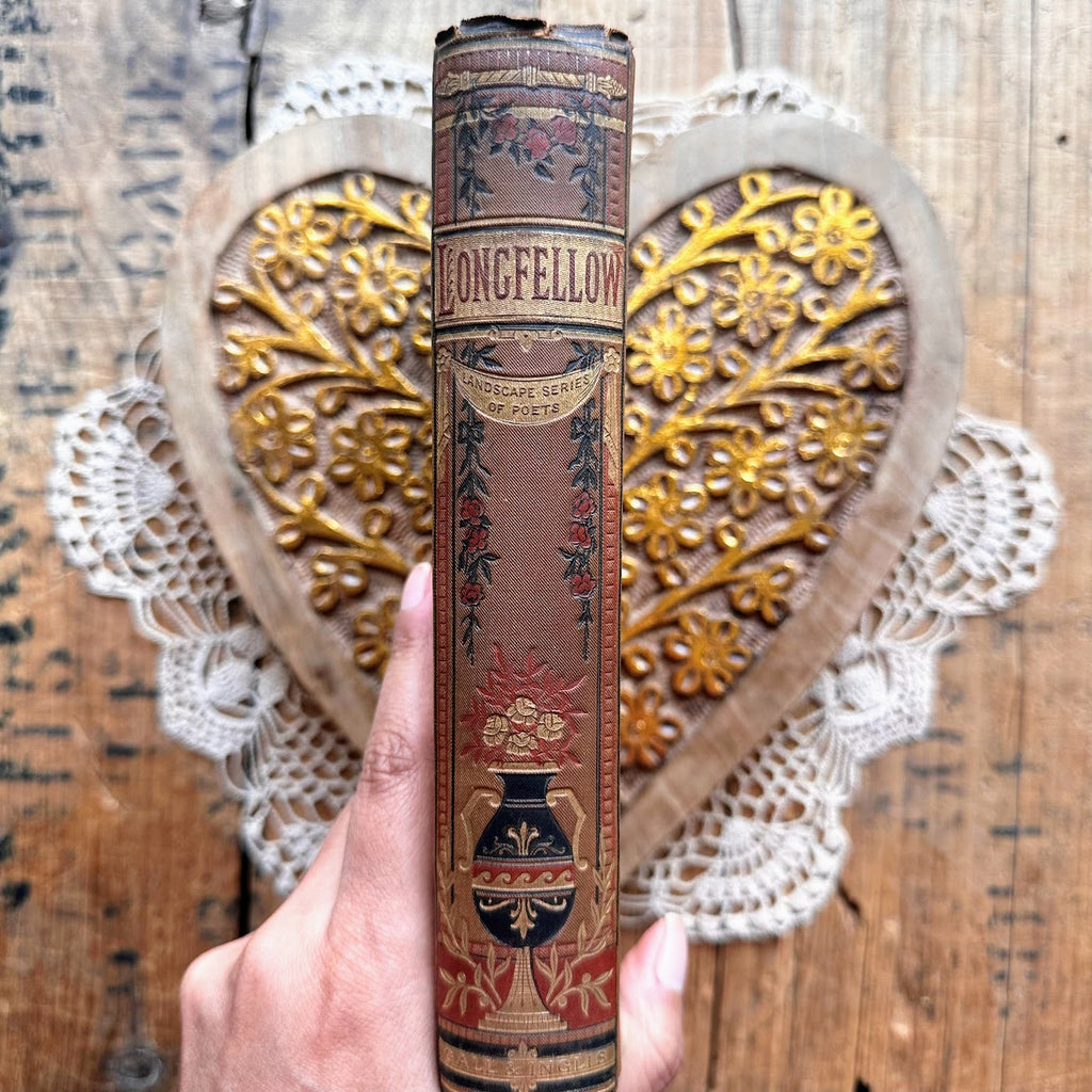 This is a pretty comprehensive book of Longfellow's poetry including Evangeline, Hiawatha, Tales of a Wayside Inn, and many more. This book would be amazing to display on a bookshelf or gift to someone who loves antique books, poetry, or Longfellow.