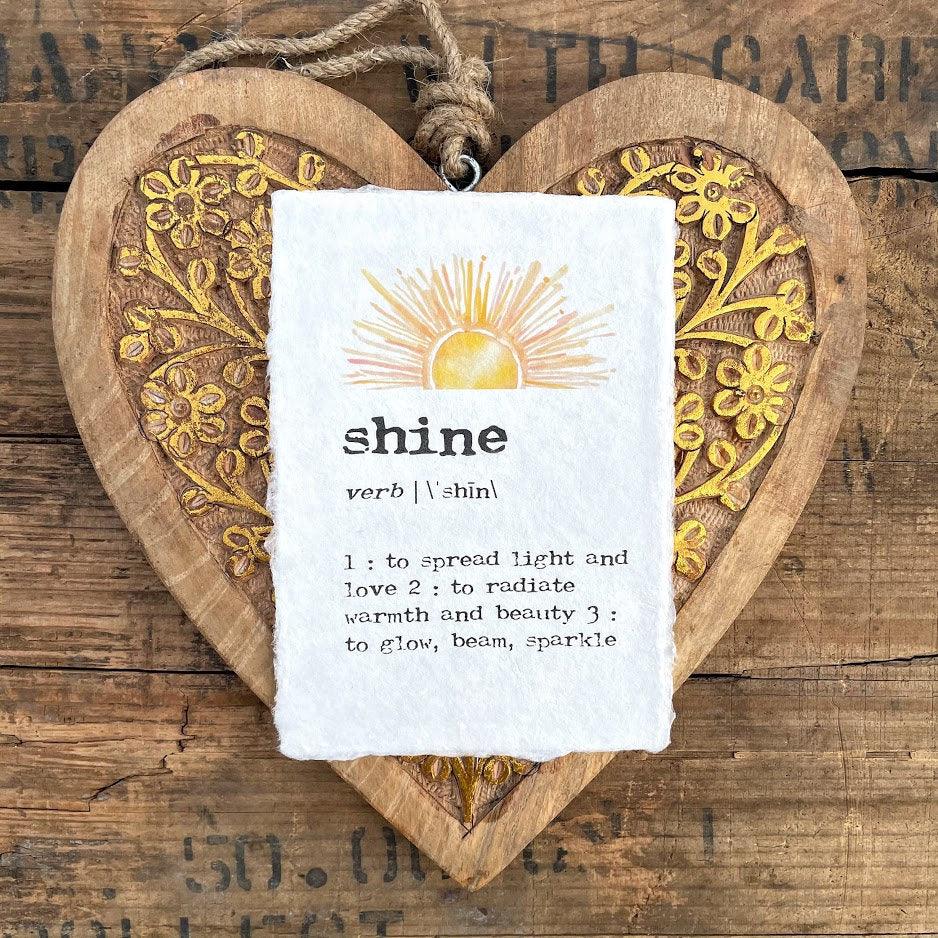 shine definition print in typewriter font on handmade cotton paper with original sun watercolor image by artist Patricia Shaw.