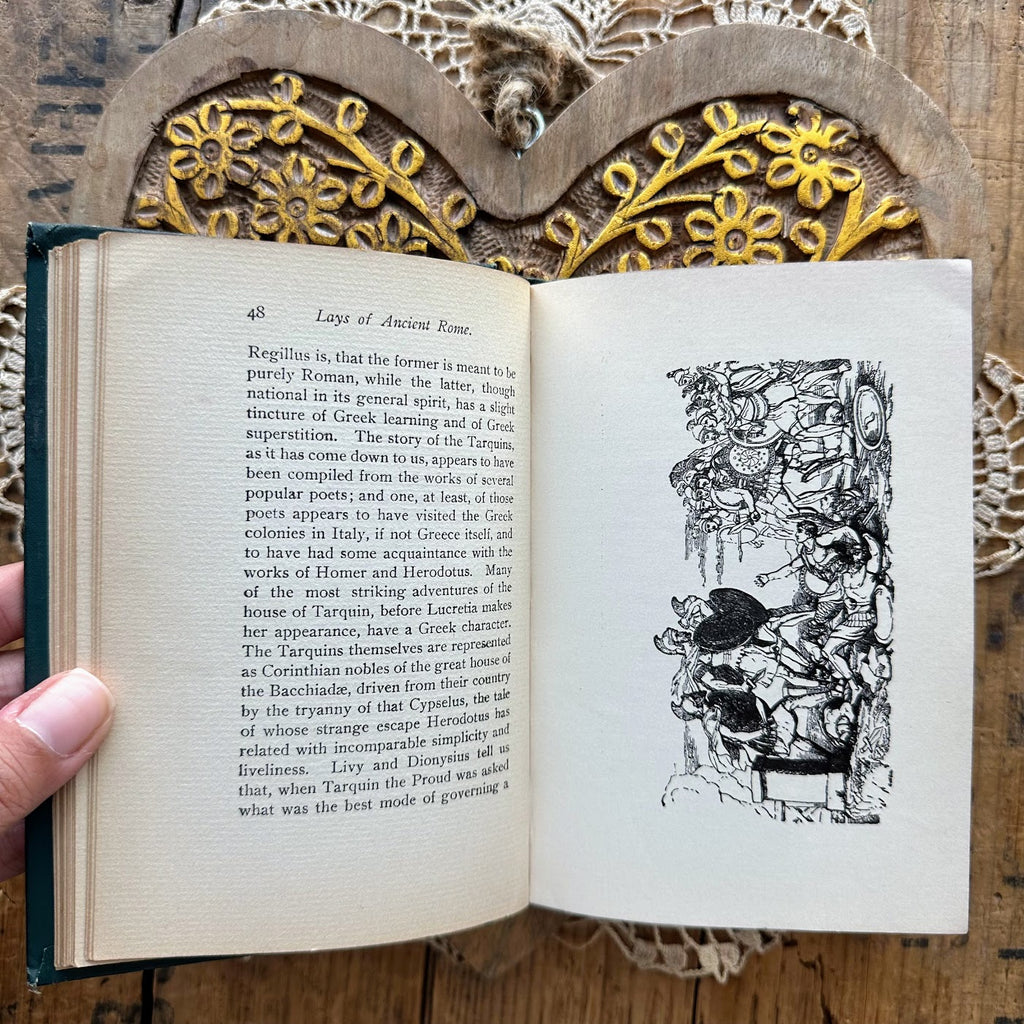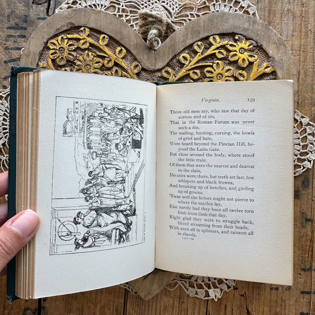 This book is unique because it is bound with the wrong cover. The cover is for The Lady of the Lake by Sir Walter Scott, but inside is The Lays of Ancient Rome by T.B. Macaulay. Either way, it has a beautiful Henry Altemus cover design picturing a house in the countryside. There are also black and white illustrations throughout.