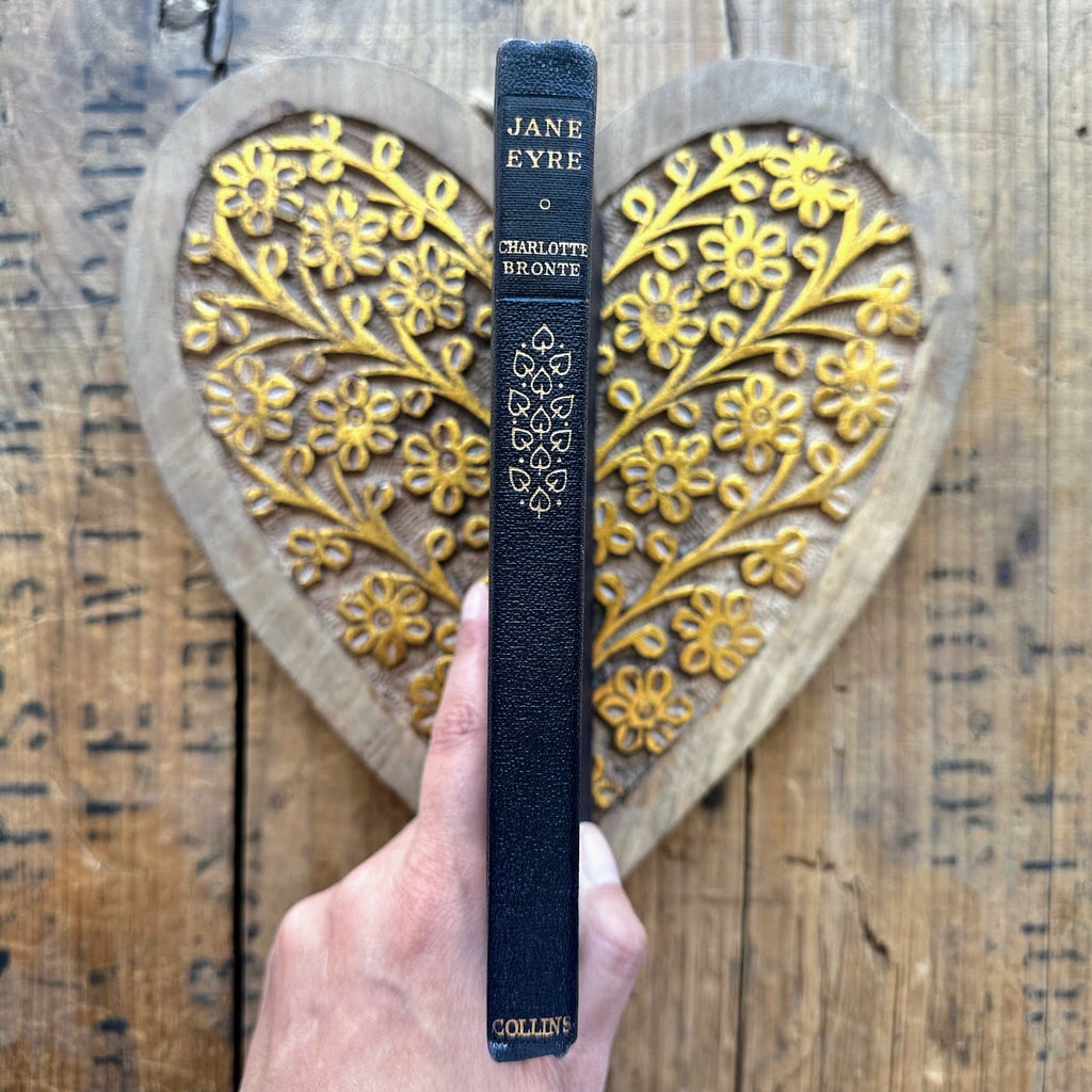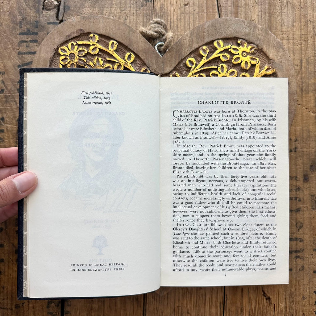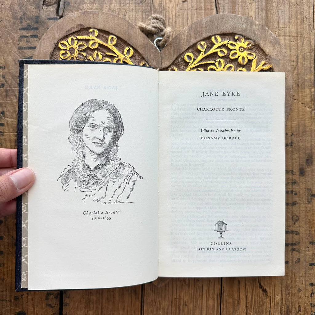 Vintage 1961 Jane Eyre by Charlotte Bronte book with a navy blue textured cloth flex cover published by Collins in England.