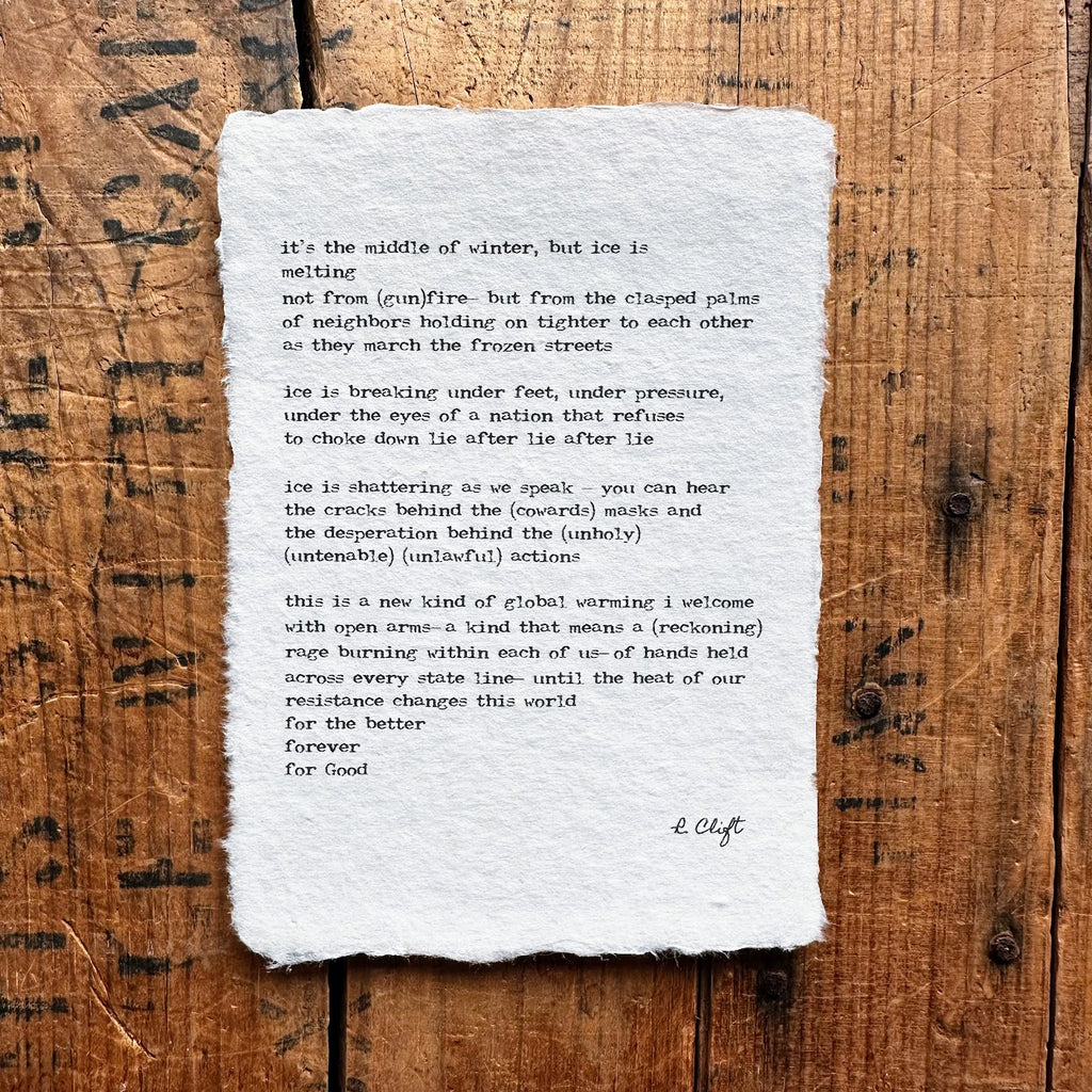 The words are printed in a typewriter font on handmade cotton rag paper with deckle edges. The color of the paper is a natural, unbleached white but may occasionally have tiny speckles of random color from other fibers mixed in. Size varies slightly because of the imperfect nature of handmade paper, but will be roughly 5" x 7", 8" x 10", or 11" x 14" based on your selection.