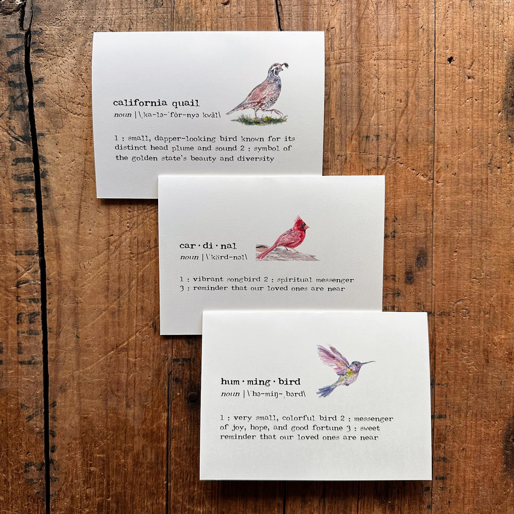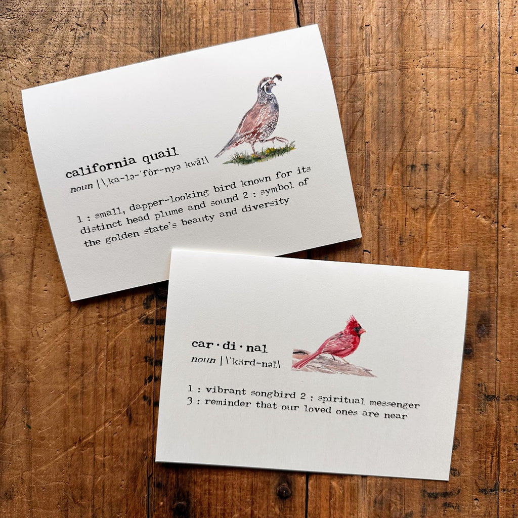 A california quail is a small dapper-looking bird known for its distinct head plume and sound as well as a symbol of the golden state's beauty and diversity. This california quail definition card would make a thoughtful sentiment for anyone who lives in or is moving to california or to a bird watcher or anyone who loves cute birds.
