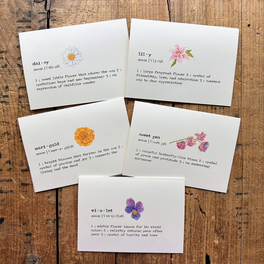 The words are printed in typewriter font on your choice of IVORY or WHITE cardstock. Size is 4" x 5.5". Corresponding envelopes are included. You will also receive a free Alison Rose Vintage sticker. Just peel the back off and seal your card with a red rose!