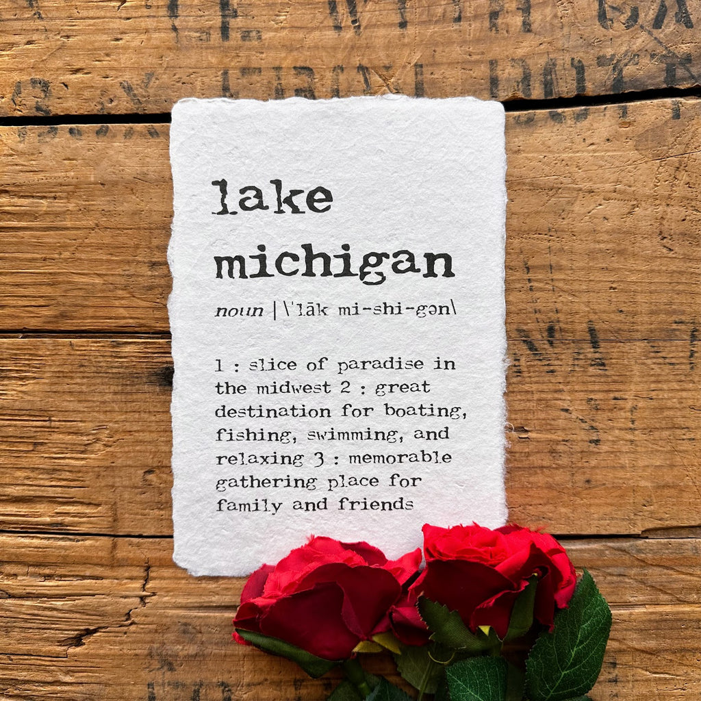 lake michigan definition print in typewriter font on handmade cotton rag paper.