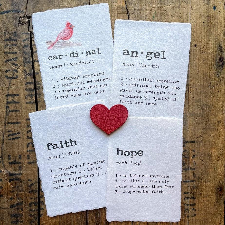 The words are printed in a typewriter font on handmade cotton rag paper. The color of the paper is a natural, unbleached white but may occasionally have tiny speckles of random color from other fibers mixed in. Size varies slightly because of the imperfect nature of handmade paper, but will be roughly 5" x 7", 8" x 10", or 11" x 14" based on your selection.