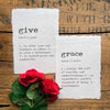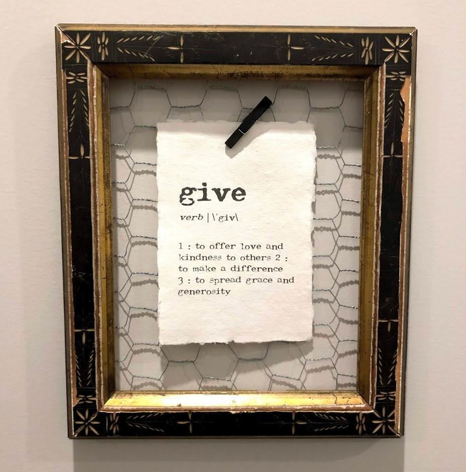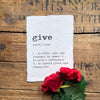 give definition print in typewriter font on handmade cotton paper. To give is to offer love and kindness to others, to make a difference, and to spread grace and generosity.