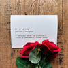 The words are printed in typewriter font on your choice of Kraft BROWN, WHITE, or IVORY cardstock. The kraft brown cardstock is not a flat brown, but has fiber mixed in. Size is 4" x 5.5". Corresponding envelopes are included. You will also receive a free Alison Rose Vintage sticker. Just peel the back off and seal your card with a red rose!