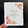 The words are printed in a typewriter font on handmade cotton rag paper with deckle edges. The color of the paper is a natural, unbleached white but may occasionally have tiny speckles of random color from other fibers mixed in. Size varies slightly because of the imperfect nature of handmade paper, but will be roughly 5" x 7", 8" x 10", or 11" x 14" based on your selection.