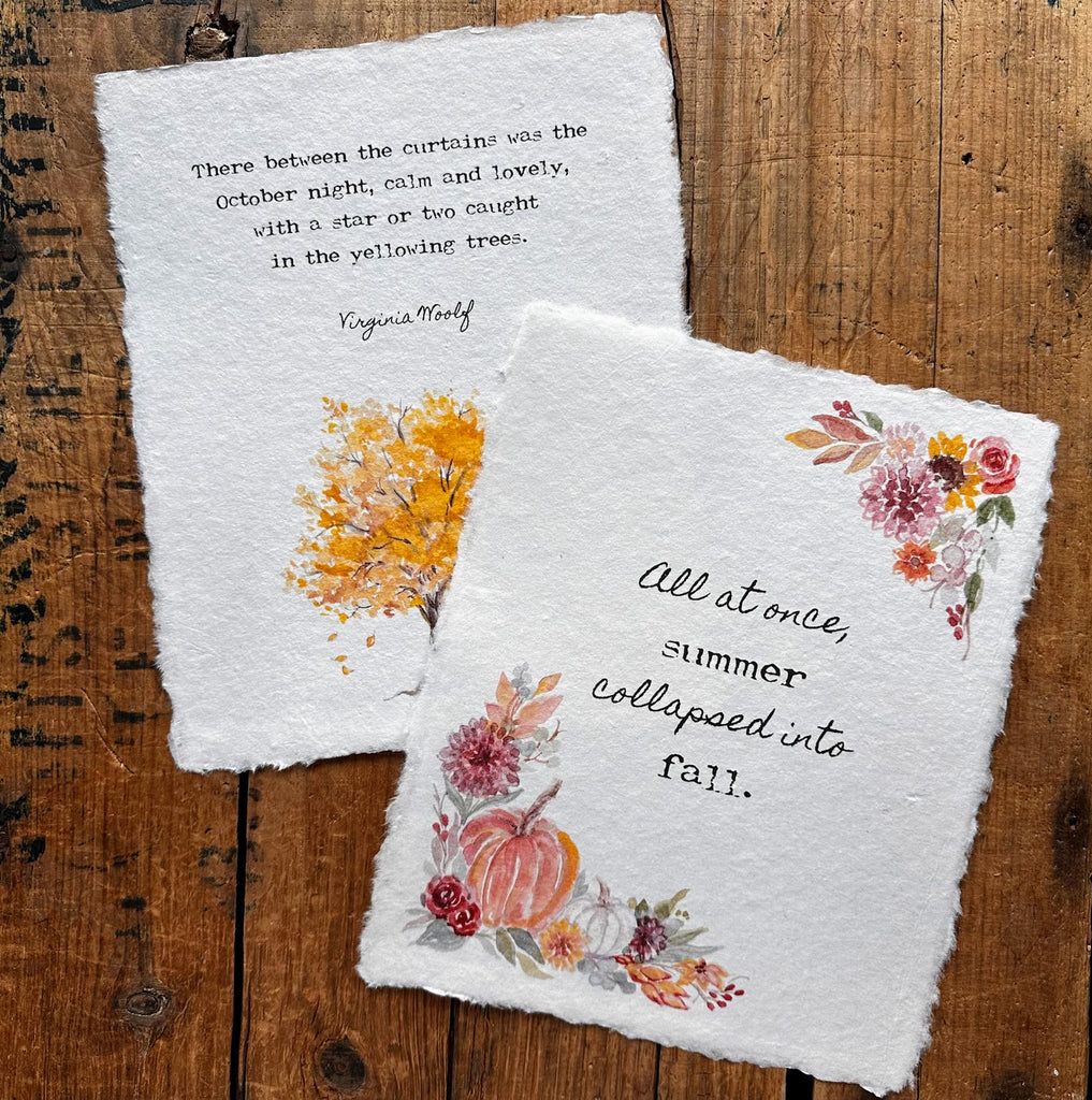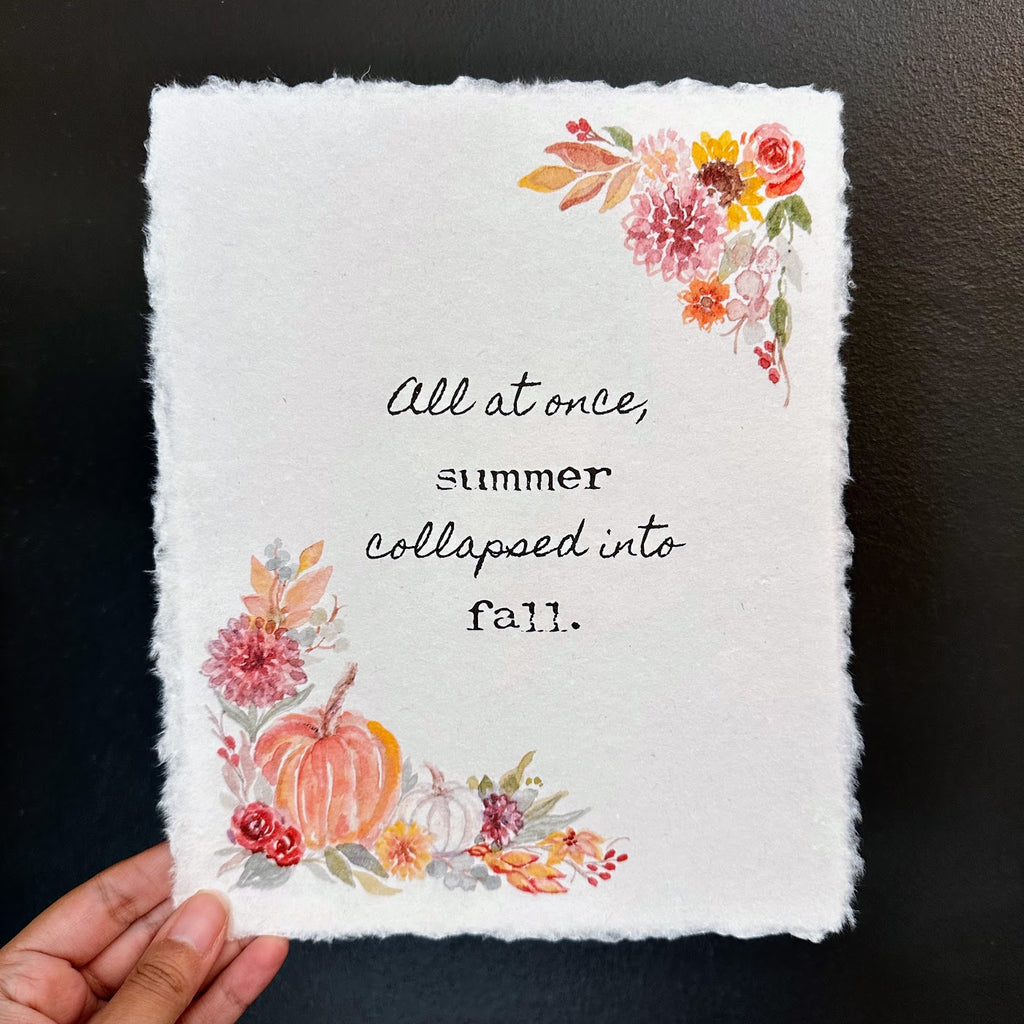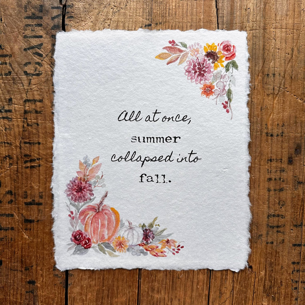 "All at once, summer collapsed into fall" quote on handmade paper with original pumpkins and fall flowers watercolor images by artist Patricia Shaw.