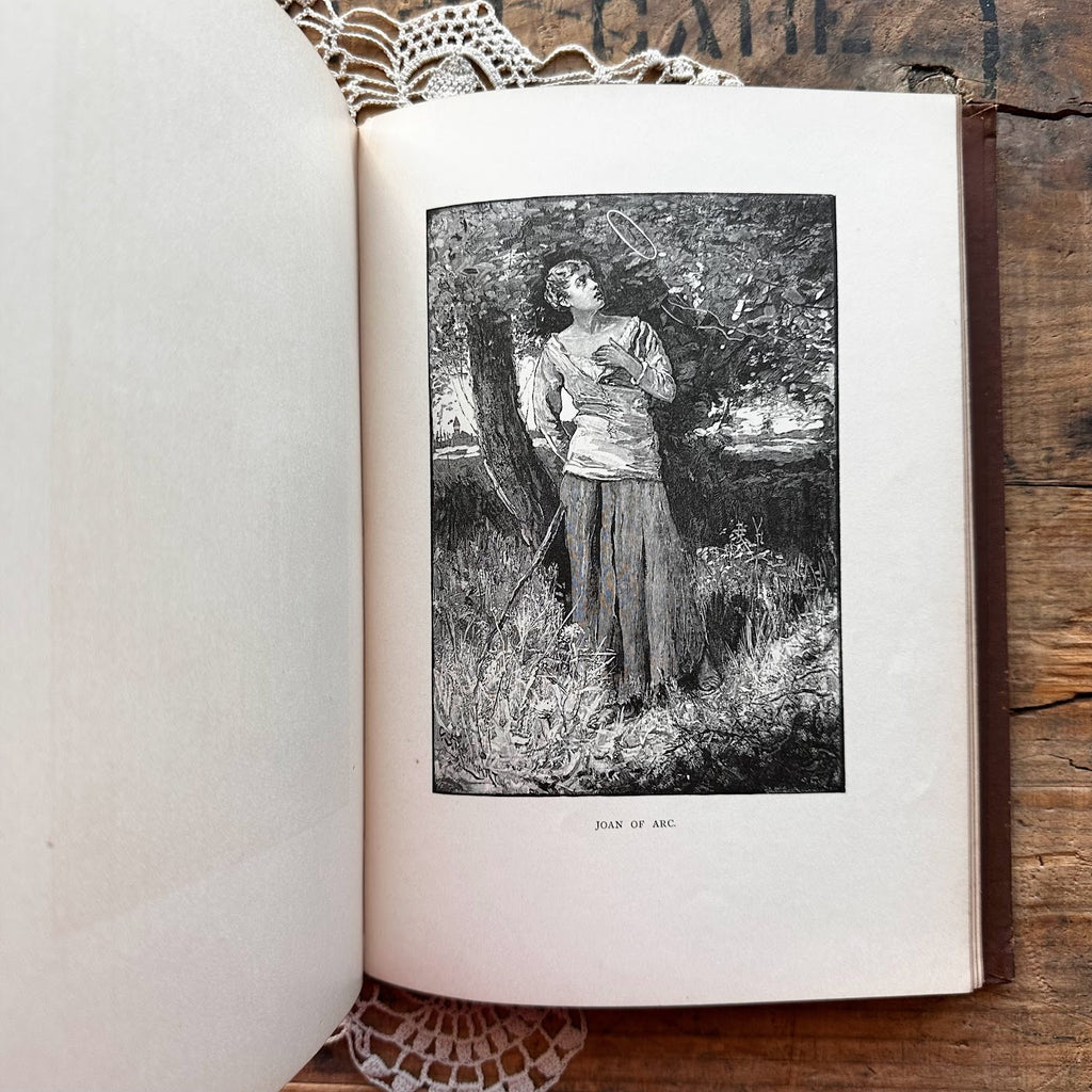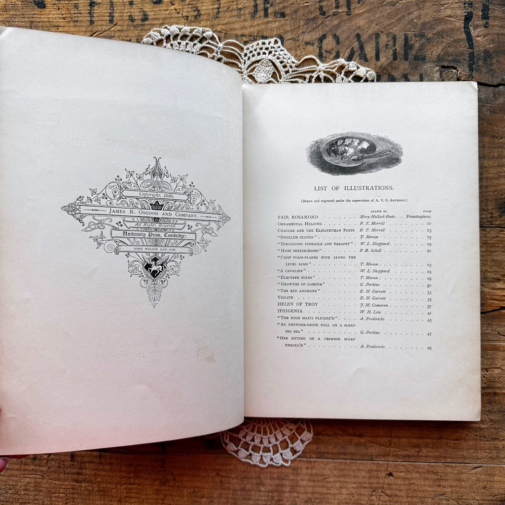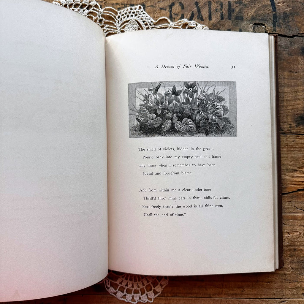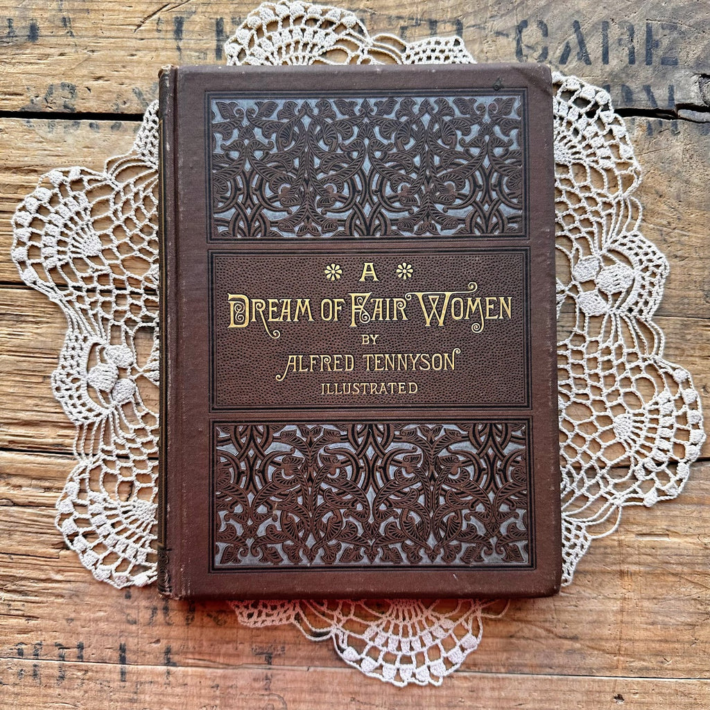 This is a beautiful 1880 First Edition book called A Dream of Fair Women by Alfred Tennyson. The book includes several engraved illustrations of women throughout history.
