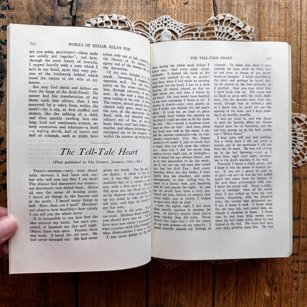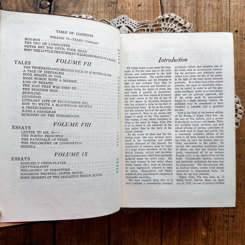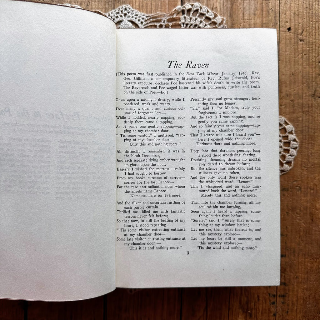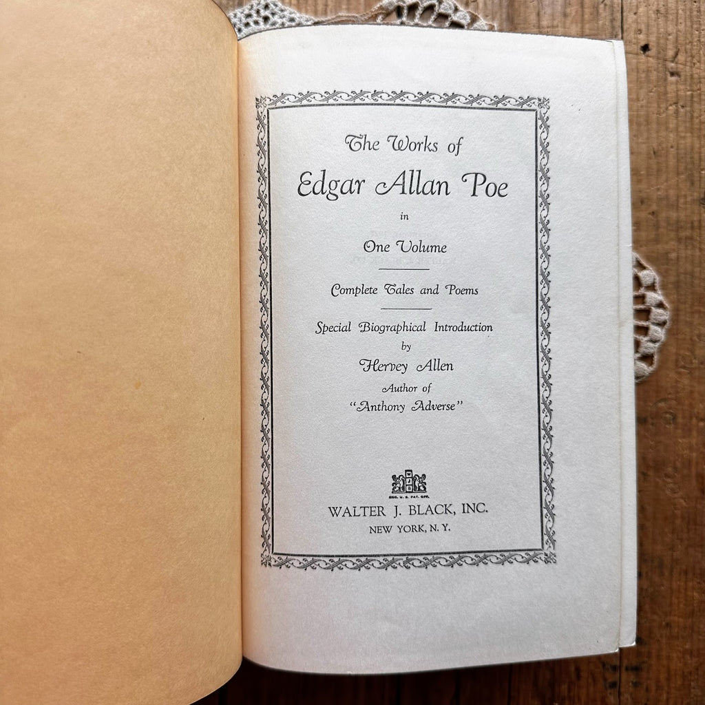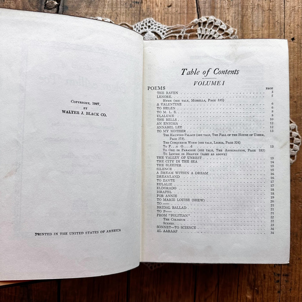 1927 Complete Poems of Edgar Allan Poe book, with a creepy black and red cover, perfect for Halloween decor. Famous poems and stories include The Raven, Lenore, Annabel Lee, Tell-Tale Heart, and many more.