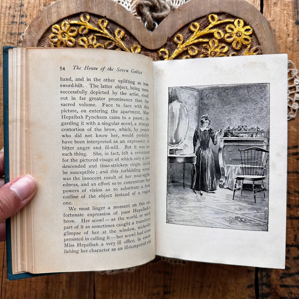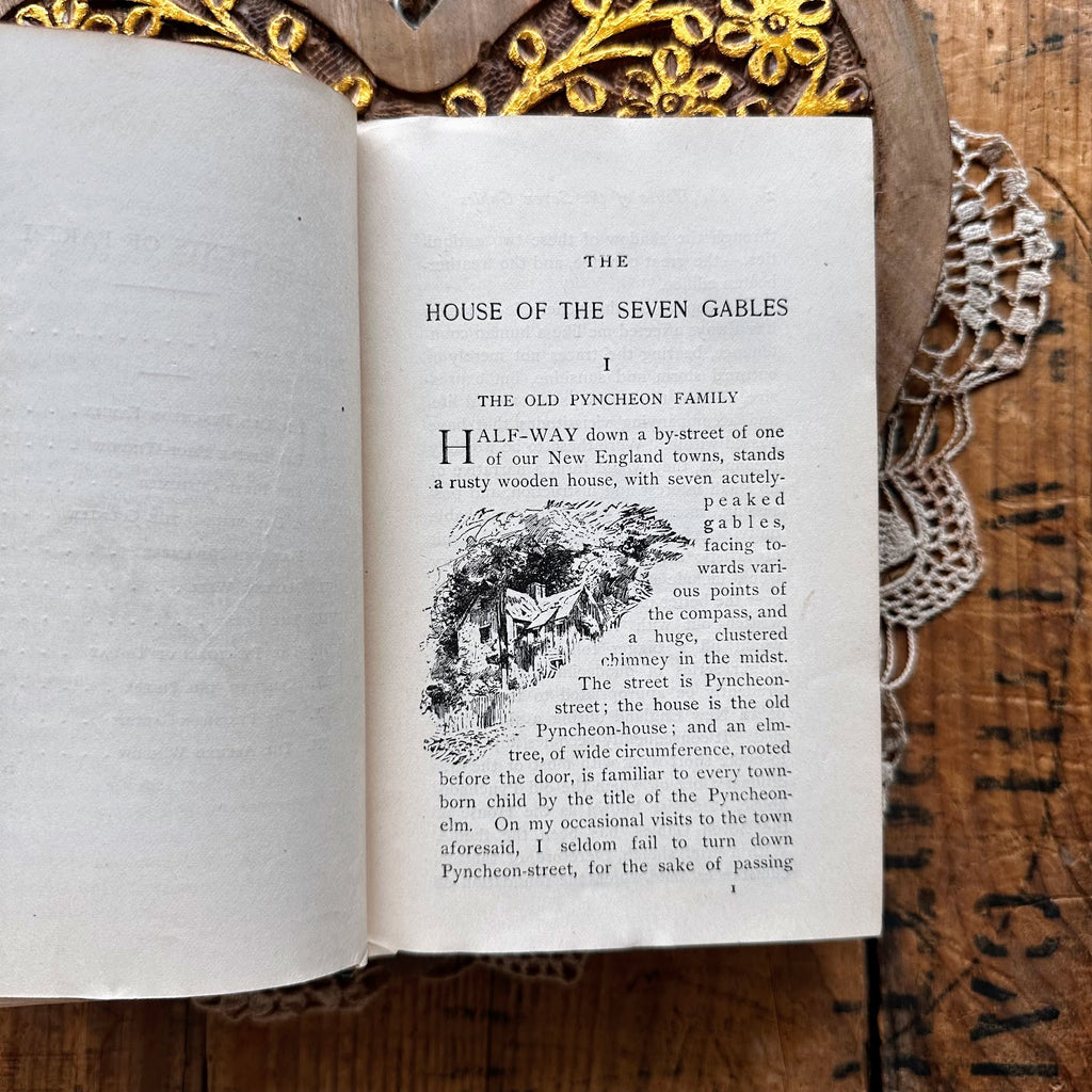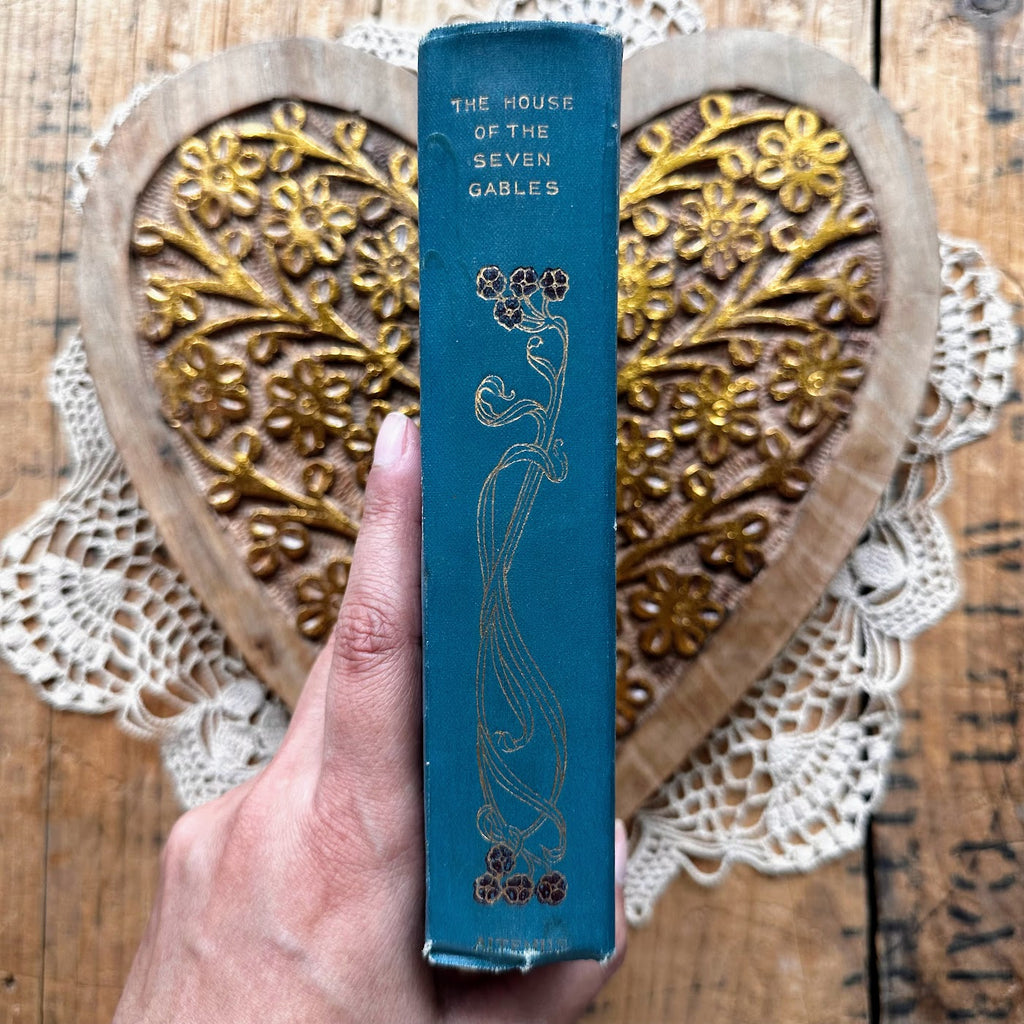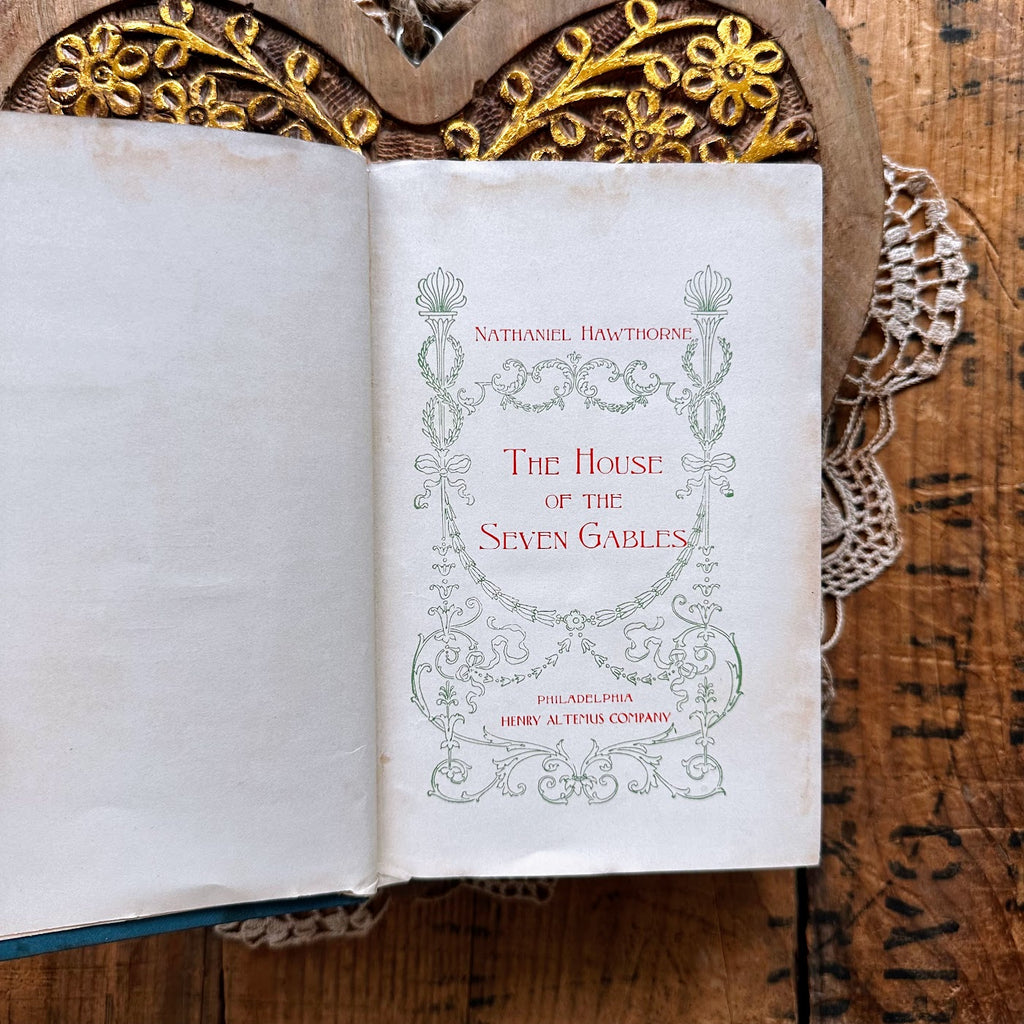 Antique The House of the Seven Gables book by Nathaniel Hawthorne, author of The Scarlet Letter. This edition has a stunning blue and gold Henry Altemus decorative cover with an image of a house and field and a gold gilt flower on the spine. There are also beautiful black and white illustrations throughout.