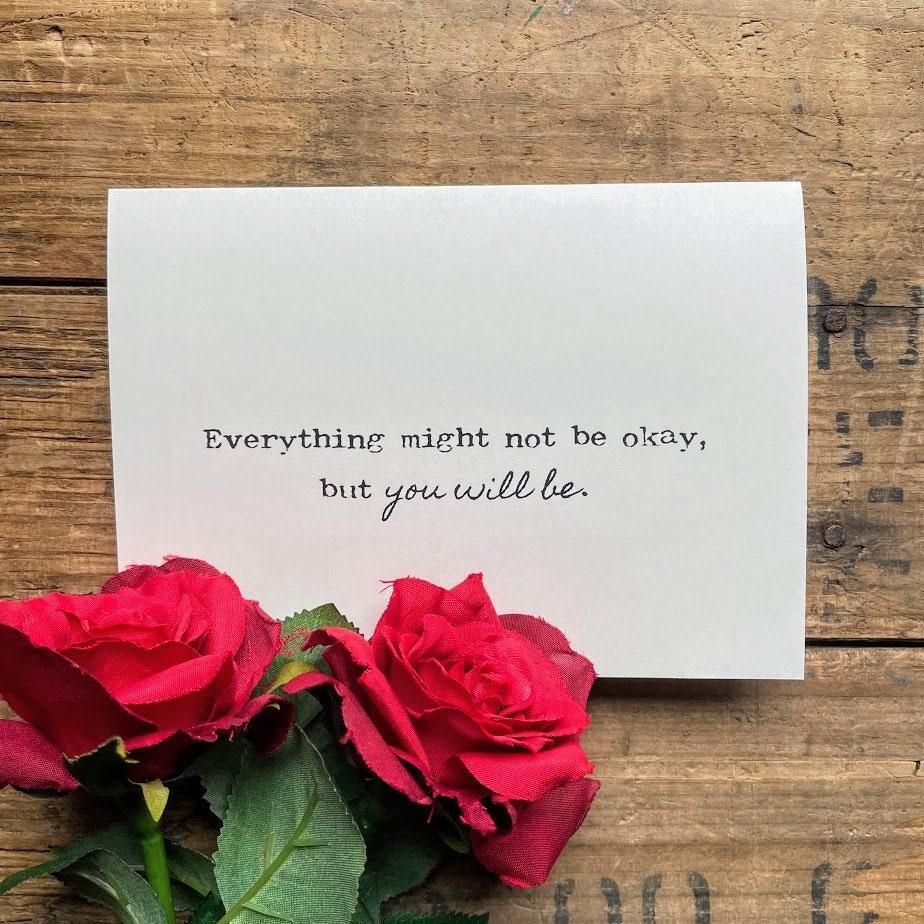 "Everything might not be okay, but you will be" quote in typewriter and script font on a blank greeting card with envelope and rose sticker. Does one of your friends, family members, or colleagues need a little encouragement after a tough time or trauma--failure, depression, divorce, loss of loved one? Send them this card to remind them not to give up hope.