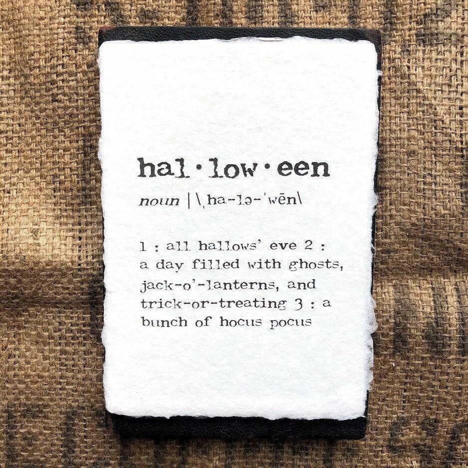 halloween definition print in typewriter font on handmade cotton paper. halloween or all hallows' eve is a day filled with ghosts, jack-o'-lanterns, trick-or-treating, and of course our favorite halloween movies like hocus pocus! Buy this halloween definition print for you or a friend's home decor.