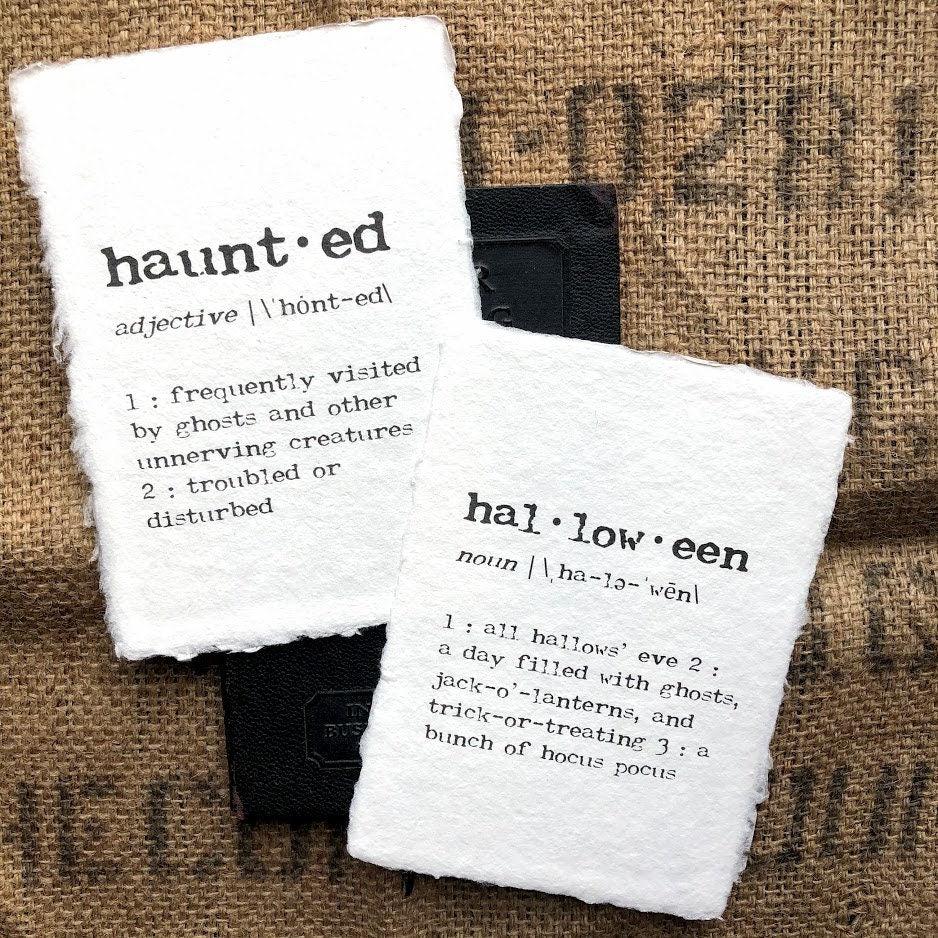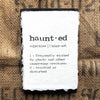 haunted definition print in typewriter font on handmade cotton paper. Are you or your house frequently visited by ghosts or other unnerving creatures? This haunted definition print is perfect Halloween home decor.