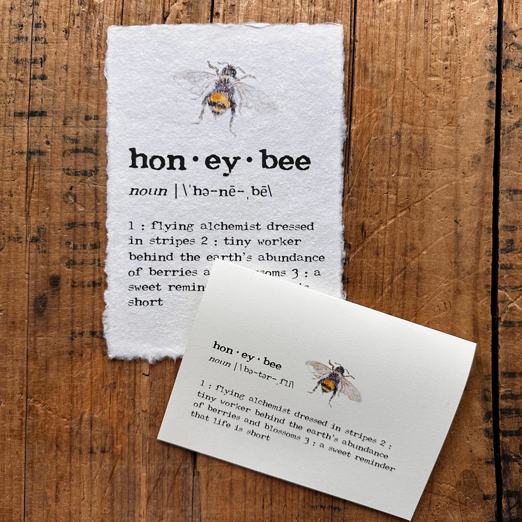 honeybee definition print in typewriter font on handmade paper with black and yellow bee watercolor image by artist Patricia Shaw.