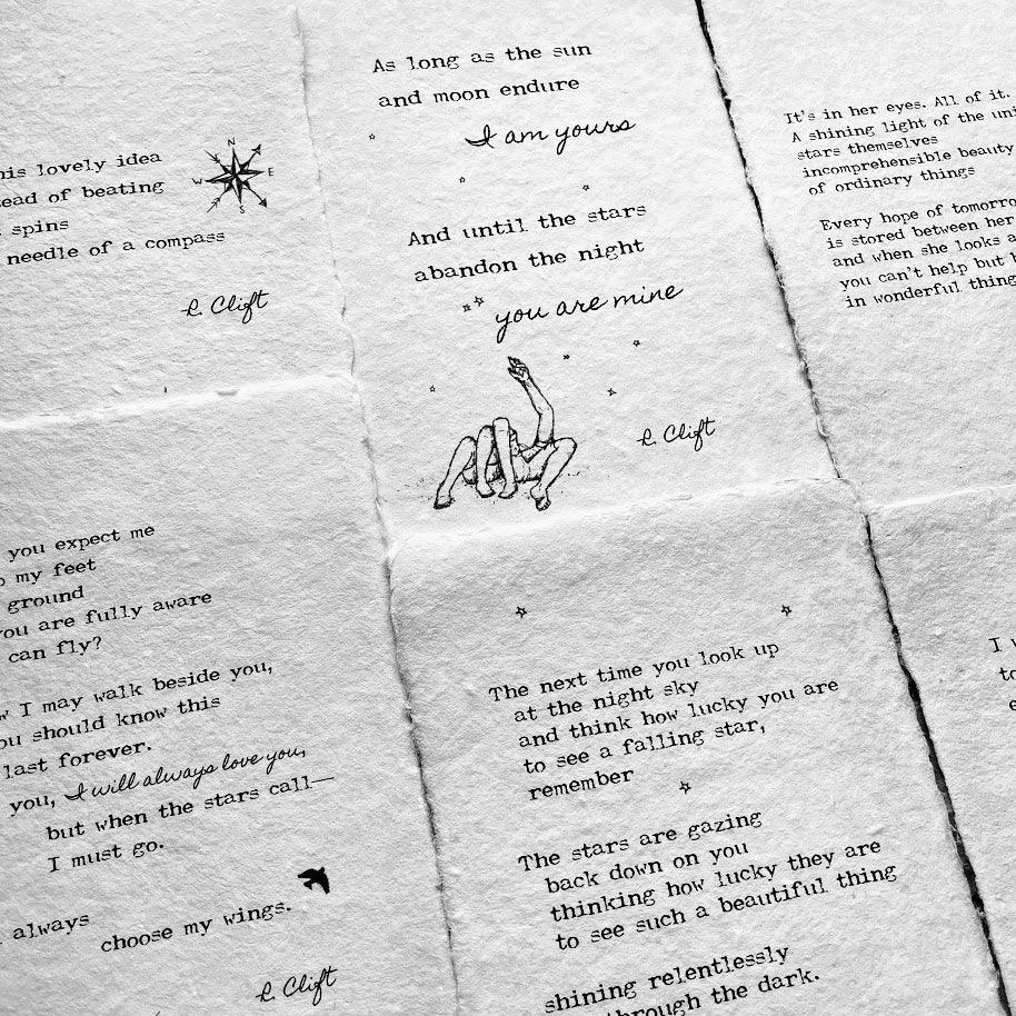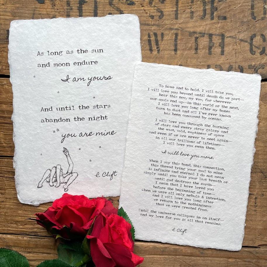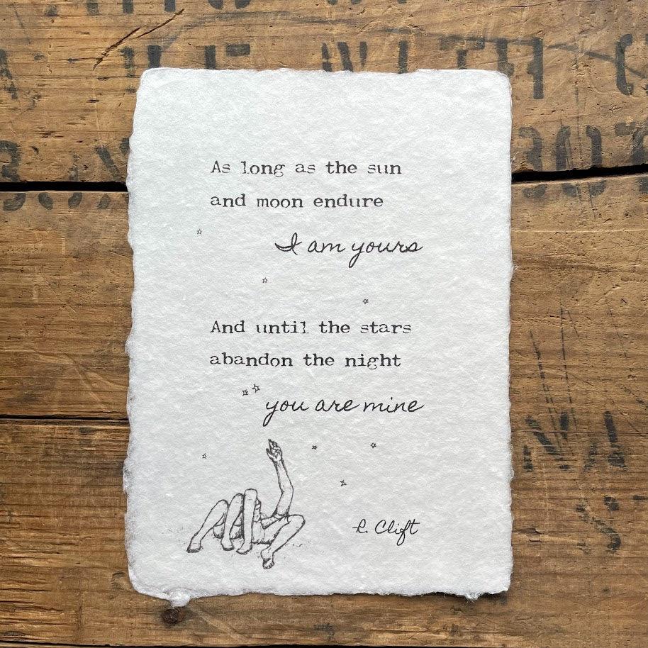 I am yours and you are mine poem by R. Clift in typewriter font on handmade paper with couple laying on the ground looking at the stars doodle.