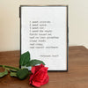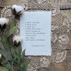 The words are printed in a typewriter font on handmade cotton rag paper. The color of the paper is a natural, unbleached white but may occasionally have tiny speckles of random color from other fibers mixed in. Size varies slightly because of the imperfect nature of handmade paper, but will be roughly 5" x 7", 8" x 10", or 11" x 14" based on your selection.