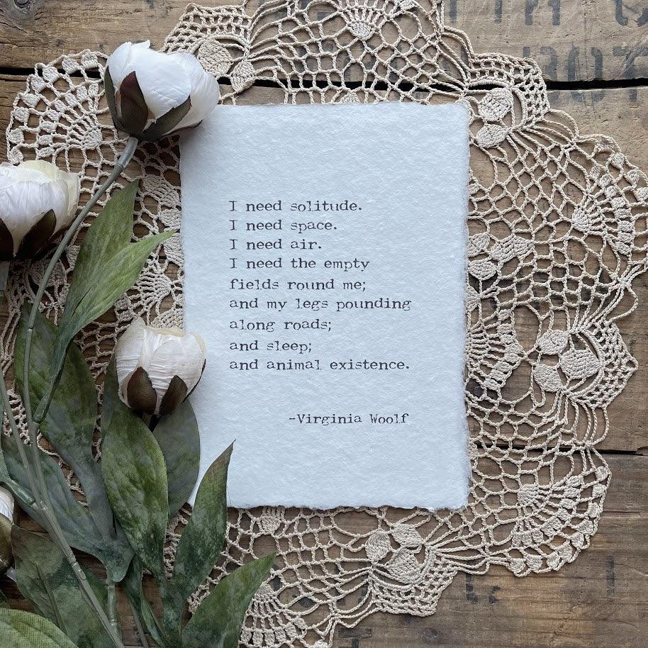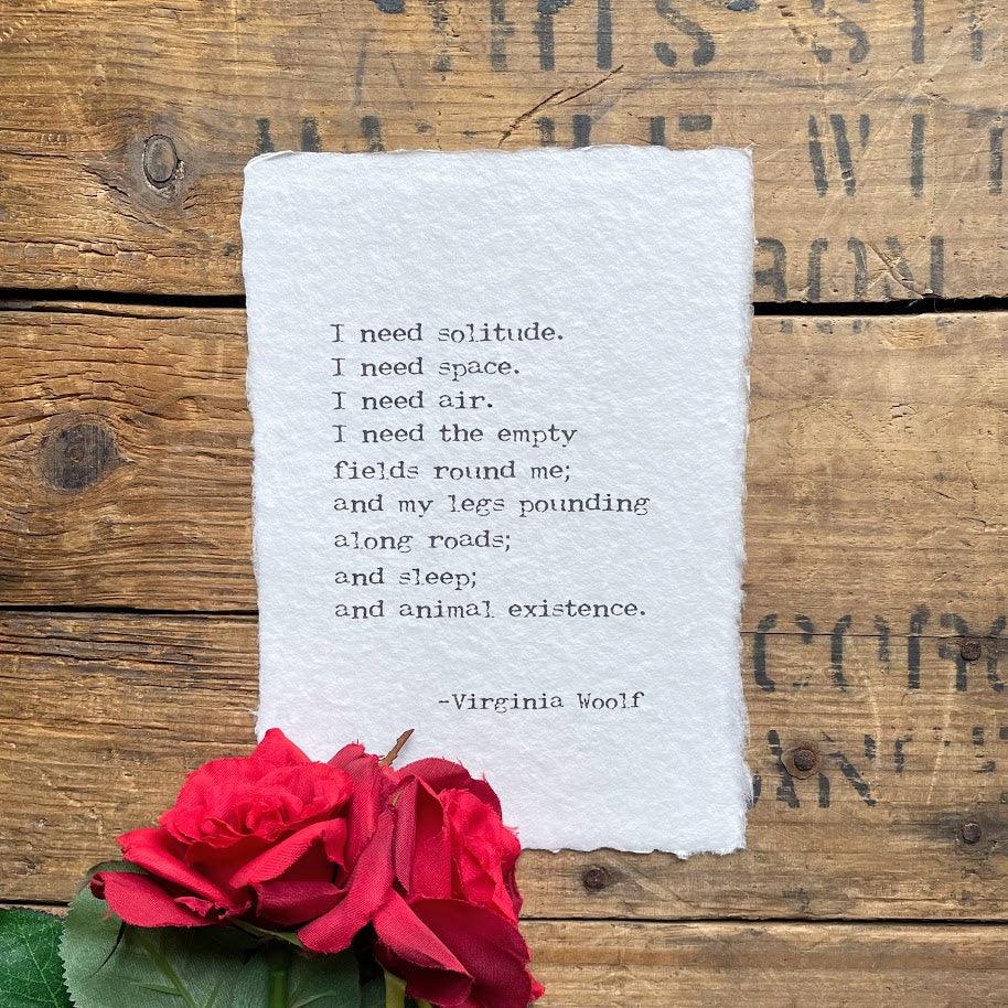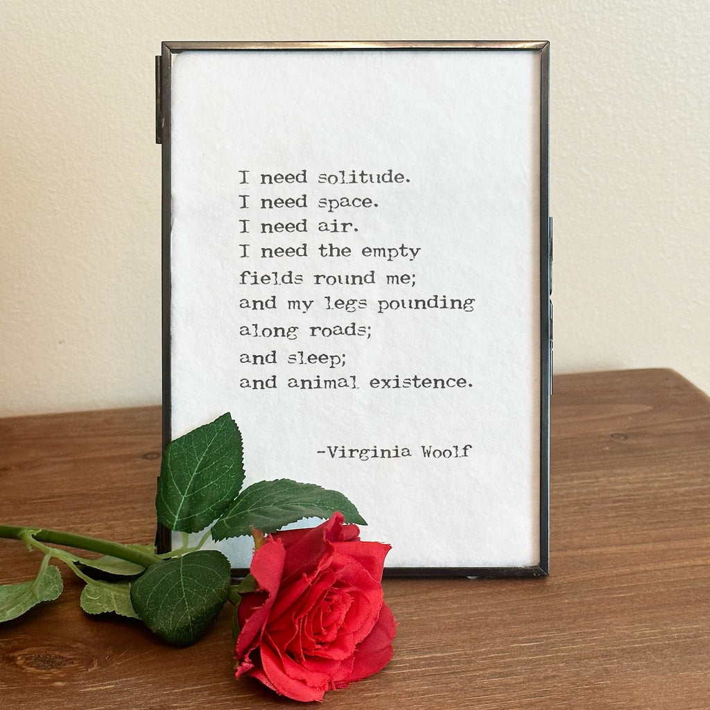 Virginia Woolf's "I need solitude. I need space. I need air. I need the empty fields round me; and my legs pounding along roads; and sleep; and animal existence.” quote print in typewriter font on handmade cotton paper.