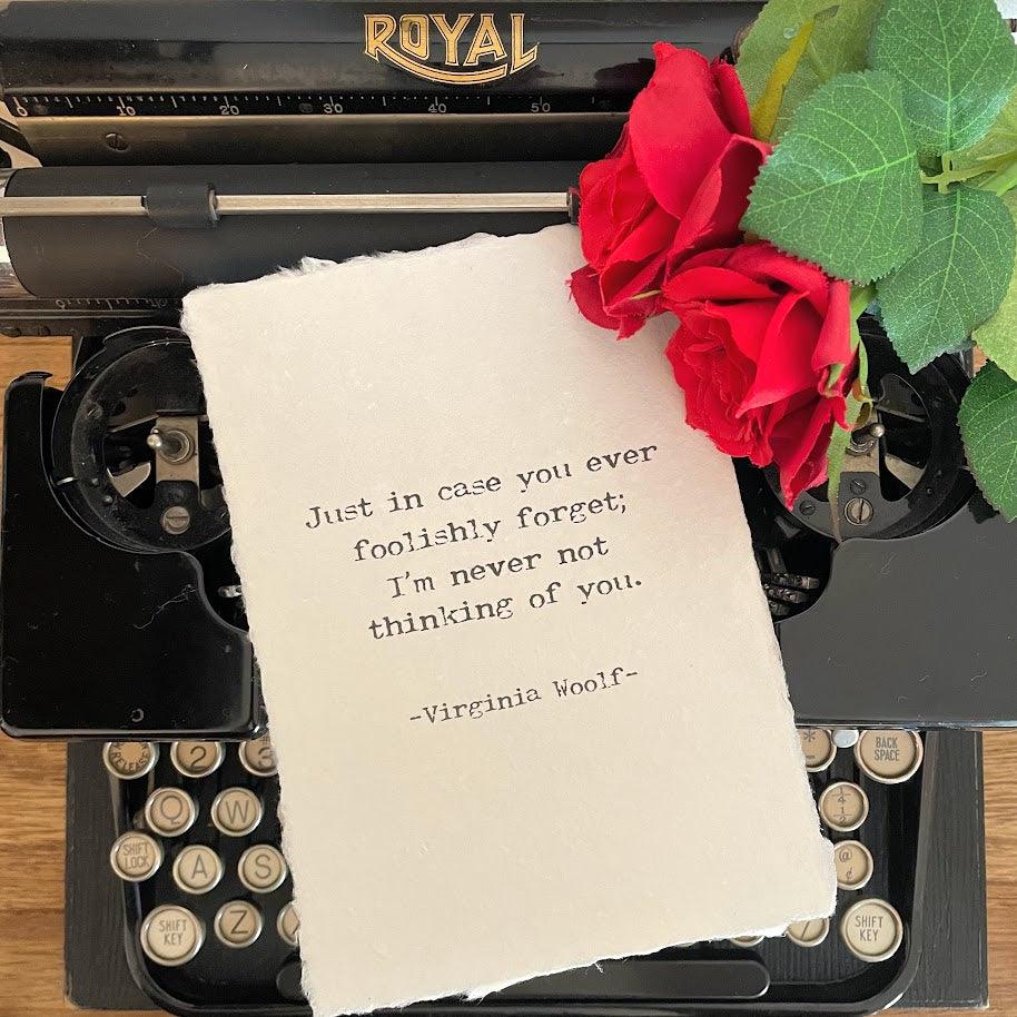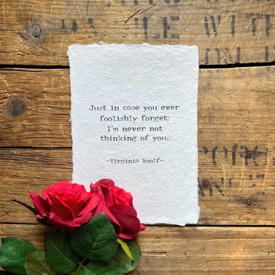 Virginia Woolf's "Just in case you ever foolishly forget; I'm never not thinking of you" quote in typewriter font printed on handmade cotton rag paper. This print is perfect to give to family, friends, or a significant other; or to purchase as a gift for those that love literature.