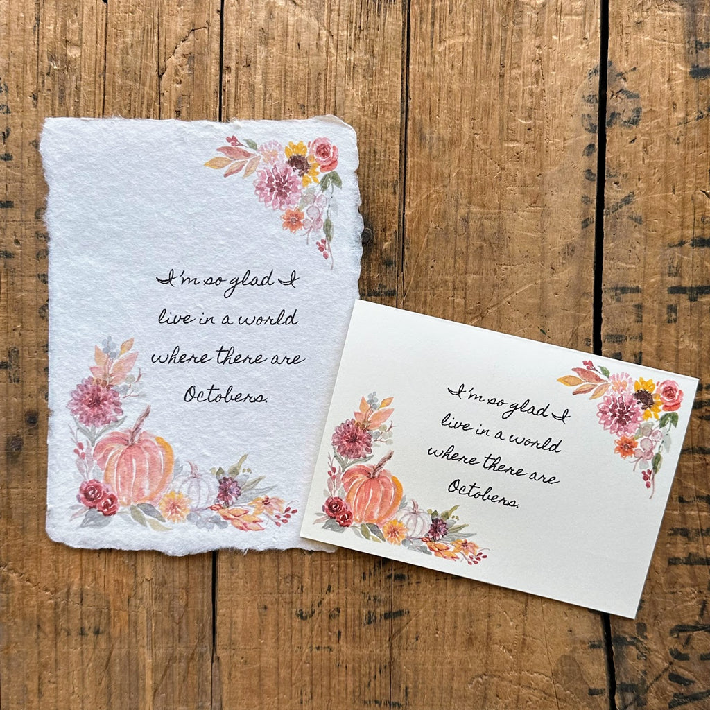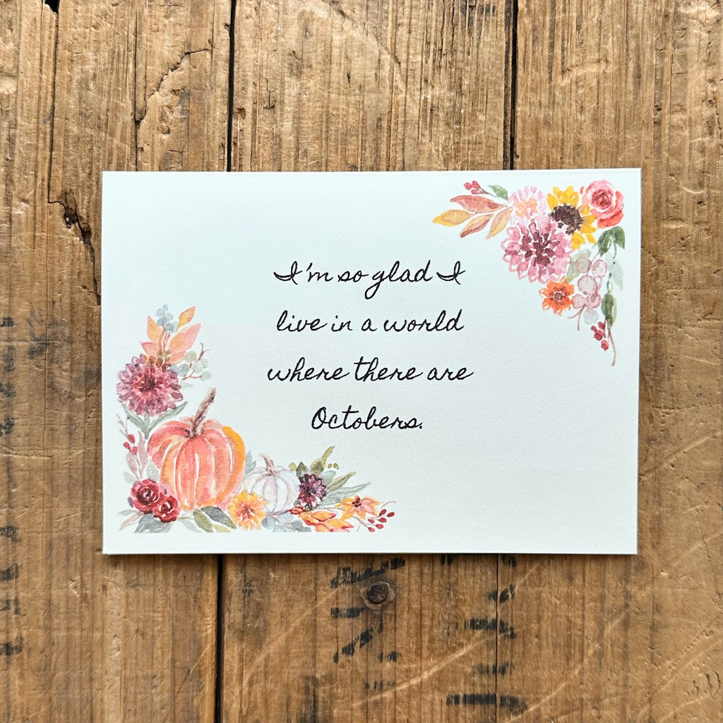 "I'm so glad I live in a world where there are Octobers" Anne of Green Gables book quote card with original pumpkins and fall flowers watercolor images by artist Patricia Shaw.