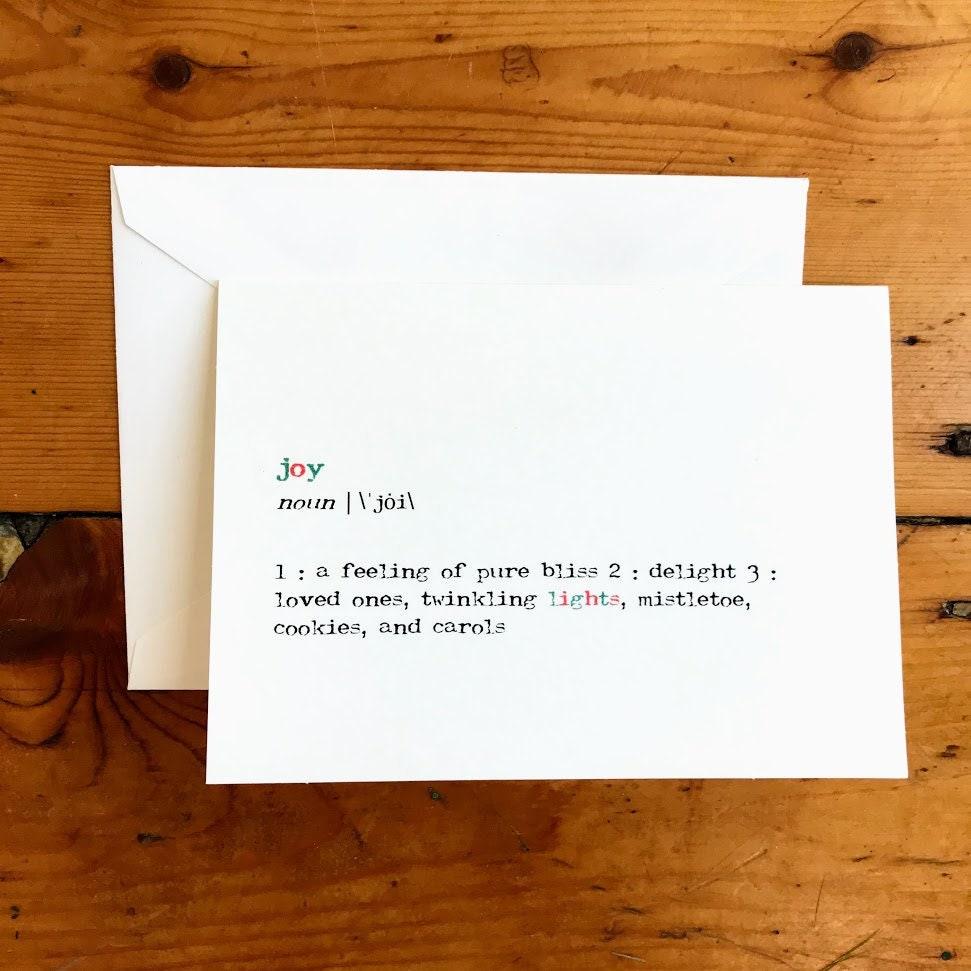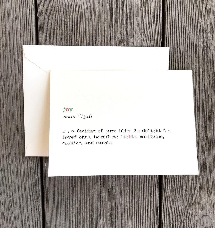 Joy around the holidays means a feeling of pure bliss, delight, loved ones, twinkling lights, mistletoe, cookies, and carols! Let your family, friends, and colleagues know you're thinking of them this holiday season with a joy definition greeting card.