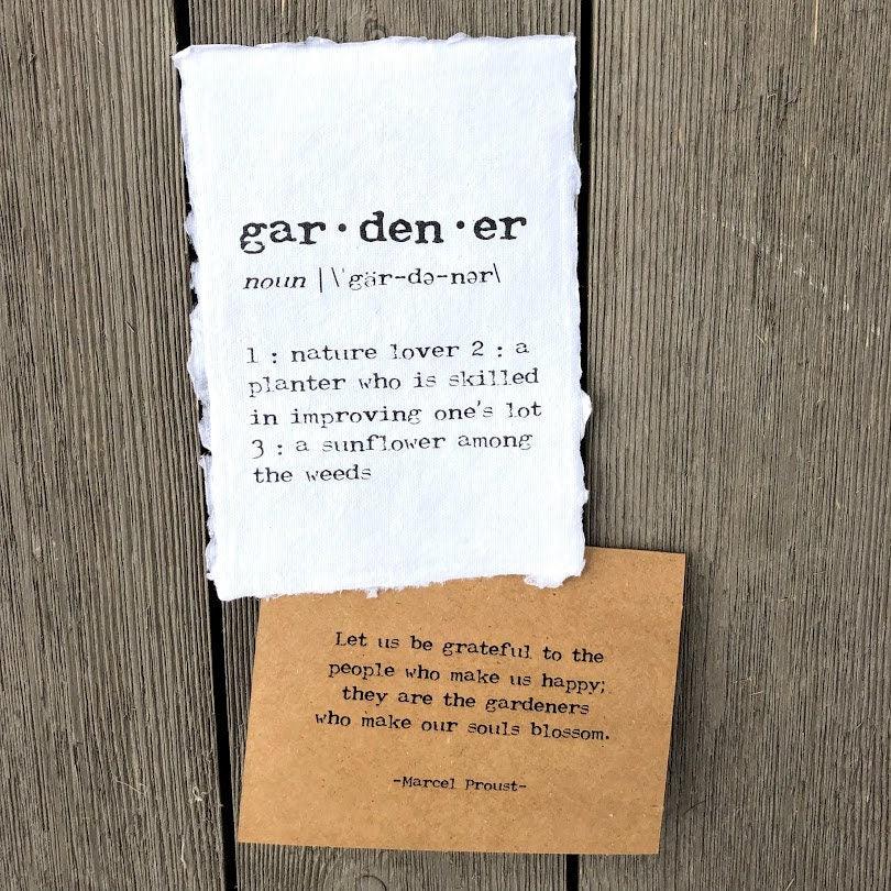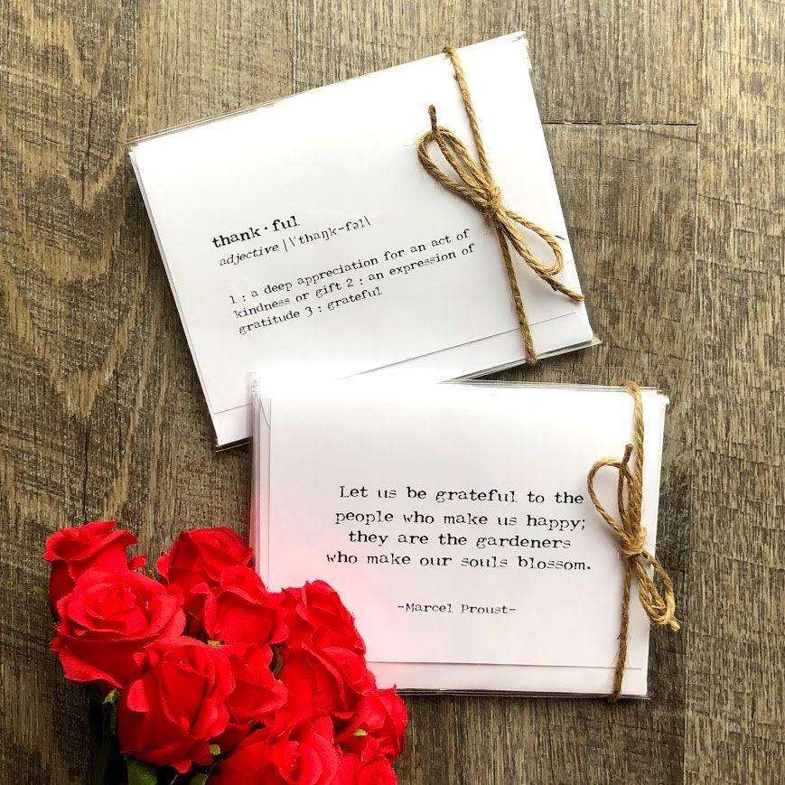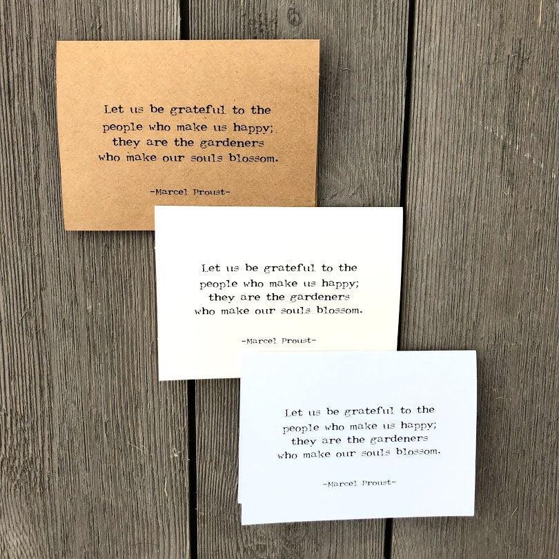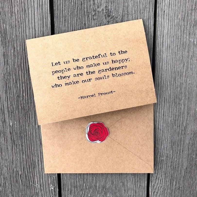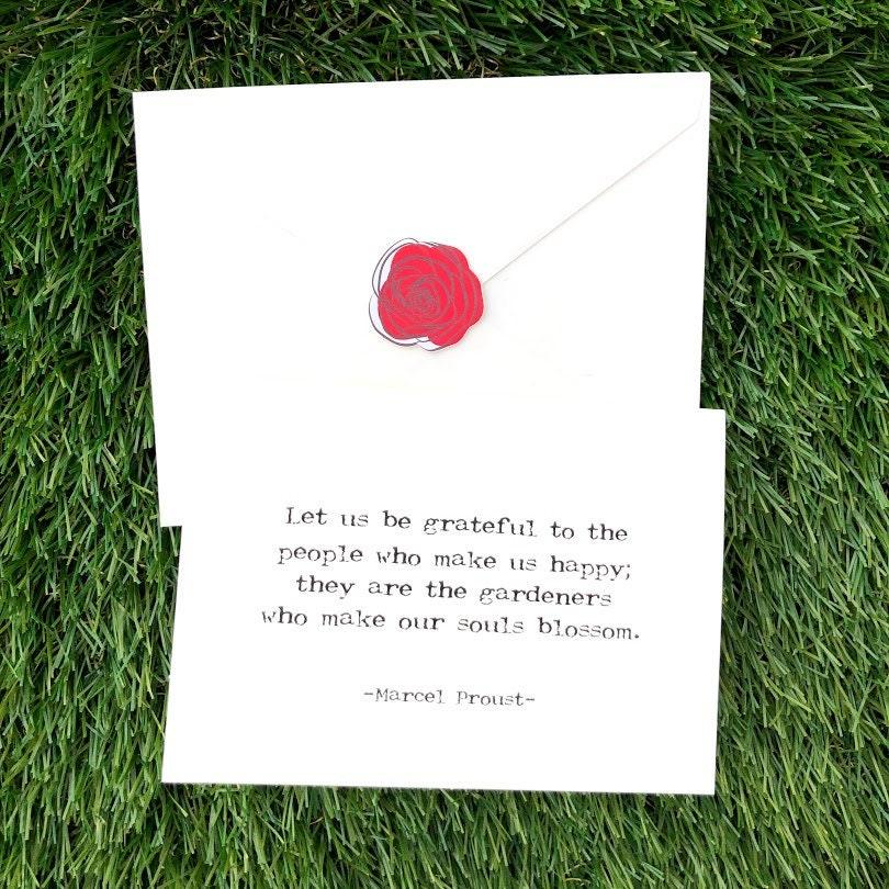 "Let us be grateful to people who make us happy; they are the gardeners who make our souls blossom." quote from Marcel Proust in typewriter font on a blank greeting card with envelope and rose sticker. This card is the perfect stationery to send to family, friends, a significant other, volunteer, or gardener; or to purchase as a gift for those that love stationery or literary quotes.