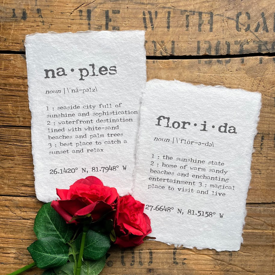naples, florida definition print in typewriter font on handmade cotton rag paper.