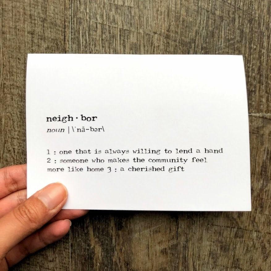 The best neighbors are always willing to lend a hand, make the community feel more like home, and are a gift to the neighborhood. Welcome your new neighbors or thank the neighbors you've lived next to for years with this neighbor definition greeting card. It's blank inside for your own personal message.