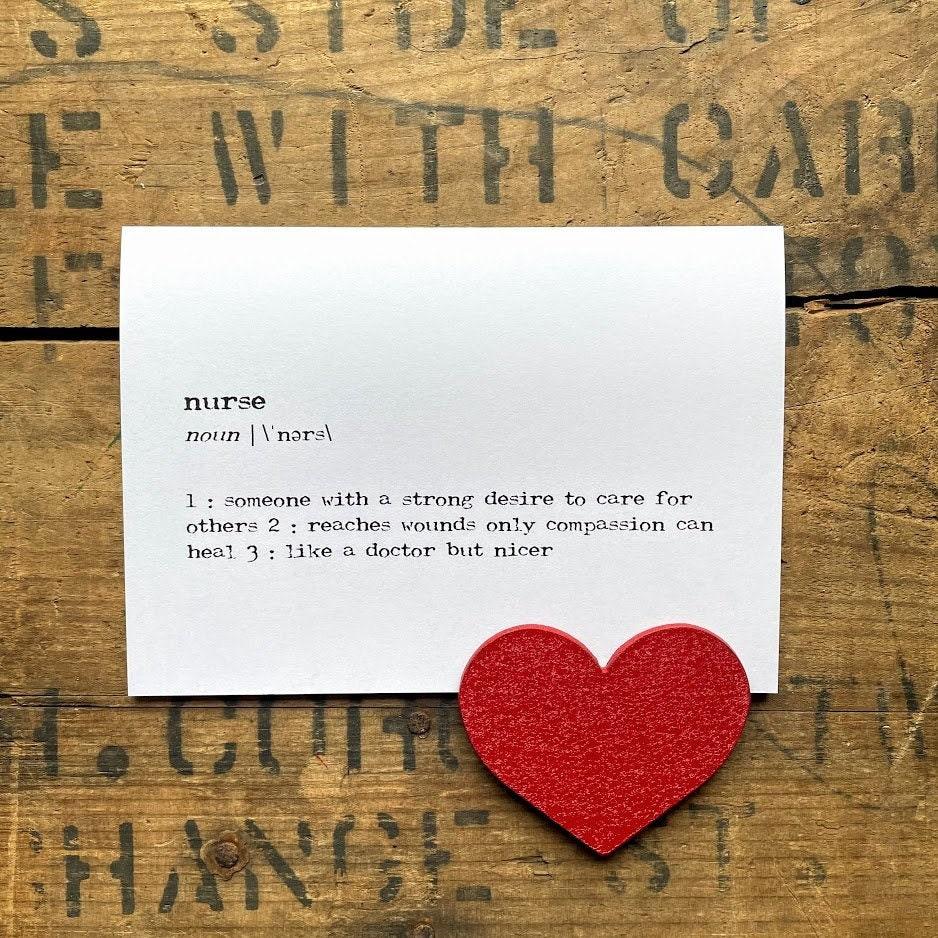 nurse definition greeting card in typewriter font with envelope and rose sticker. Nurses are people with a strong desire to care for others, they reach wounds only compassion can heal, and they're like a doctor but nicer. :-) This nurse definition card is perfect for a nursing school grad or to give to a nurse caretaker after a hospital visit, blank inside for your own personal message.