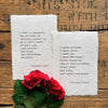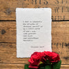 The words are printed in a typewriter font on handmade cotton rag paper. The color of the paper is a natural, unbleached white but may occasionally have tiny speckles of random color from other fibers mixed in. Size varies slightly because of the imperfect nature of handmade paper, but will be roughly 5" x 7", 8" x 10", or 11" x 14" based on your selection.