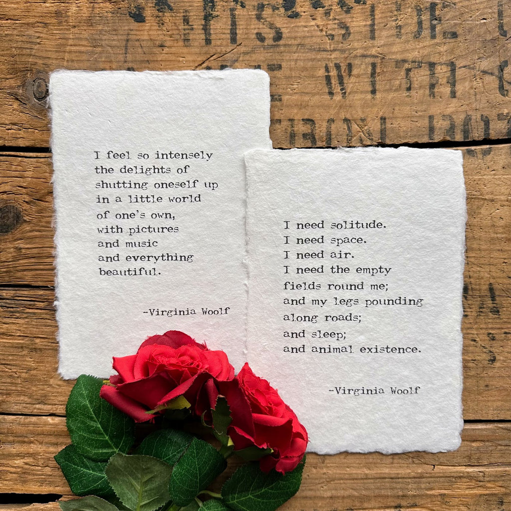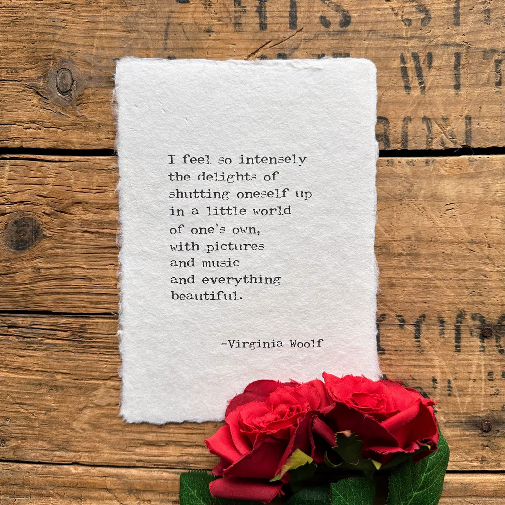 "I feel so intensely the delights of shutting oneself up in a little world of one's own, with pictures and music and everything beautiful" Virginia Woolf quote print in typewriter font on handmade paper.