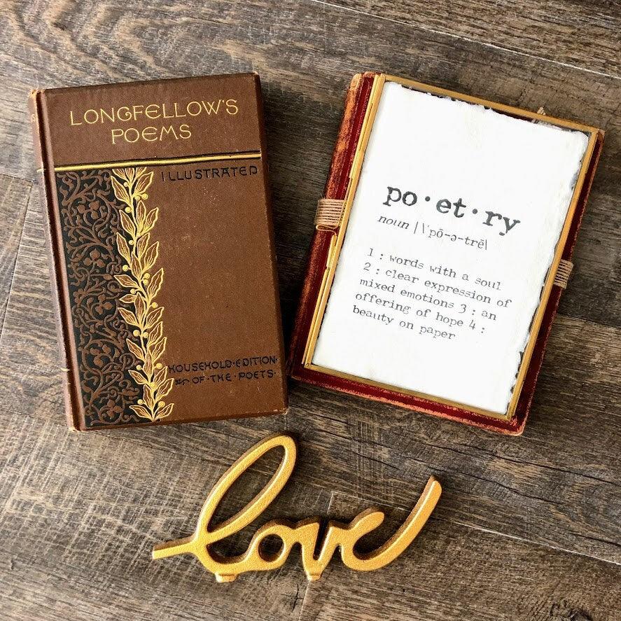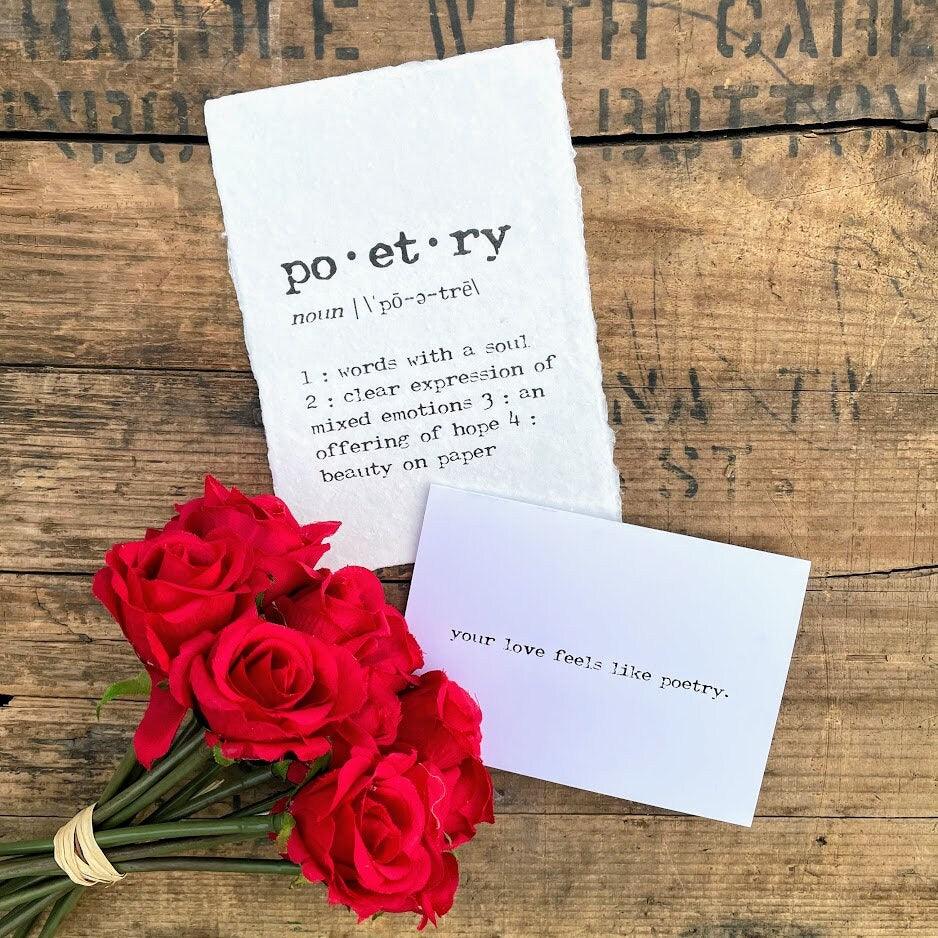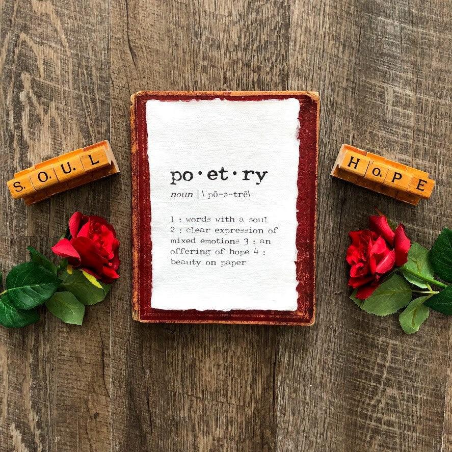 poetry definition print in typewriter font on 5x7 or 8x10 handmade cotton paper. Poetry can be described as words with a soul, a clear expression of mixed emotions, offering of hope, and beauty on paper. This is the perfect gift for you or someone you know who just can't get enough of poetry!
