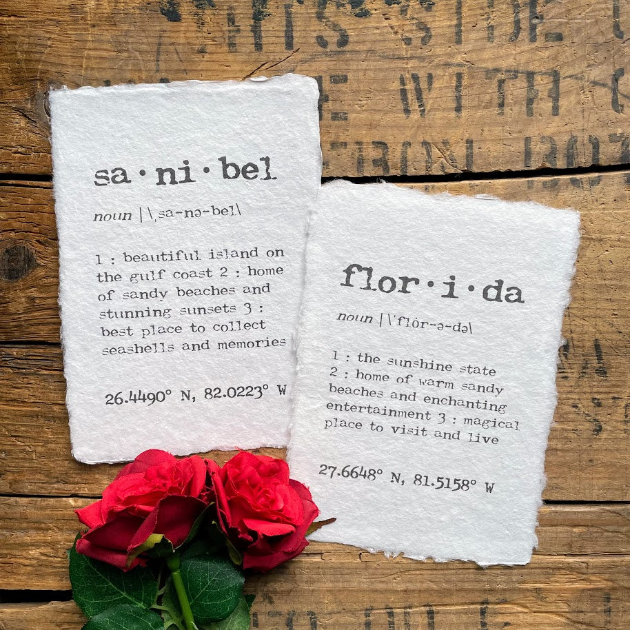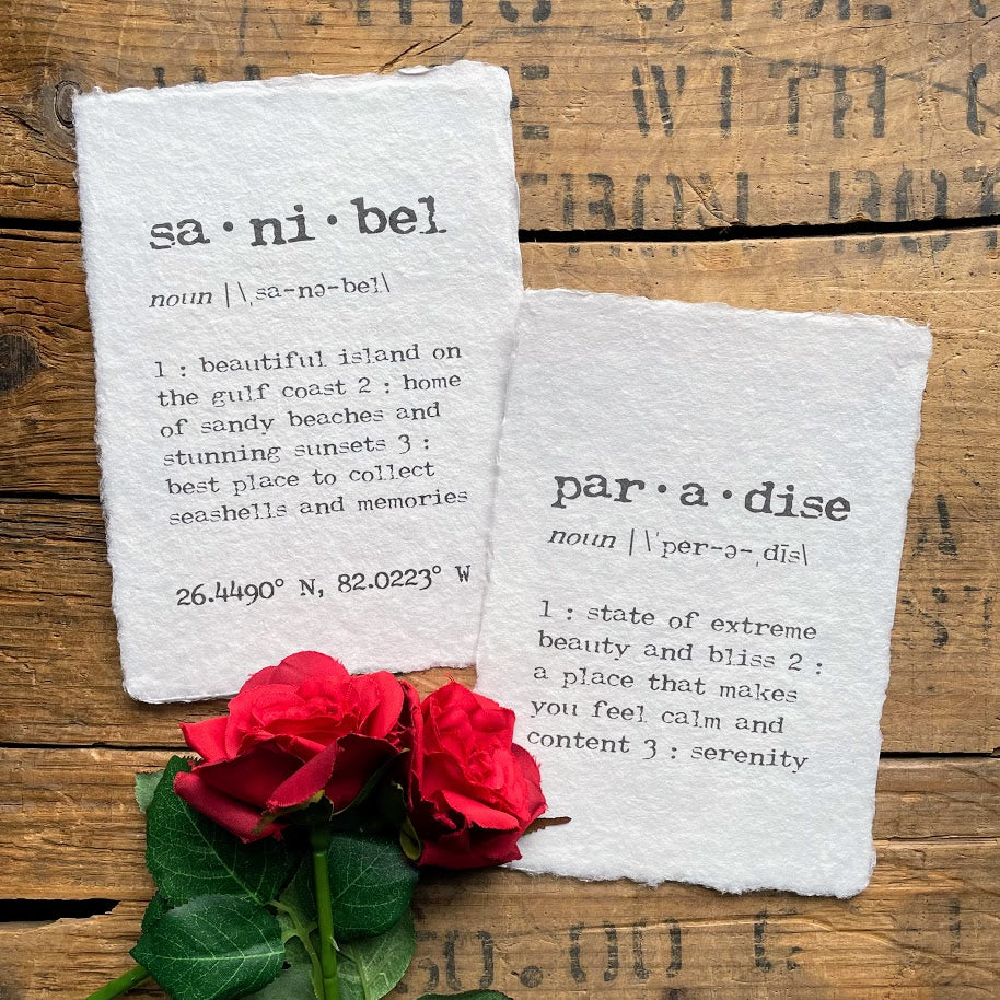 sanibel, florida definition print in typewriter font on handmade cotton rag paper.