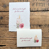 The words are printed in a script font on your choice of WHITE, or IVORY cardstock. Size is 4" x 5.5". Corresponding envelopes are included. You will also receive a free Alison Rose Vintage sticker. Just peel the back off and seal your card with a red rose!