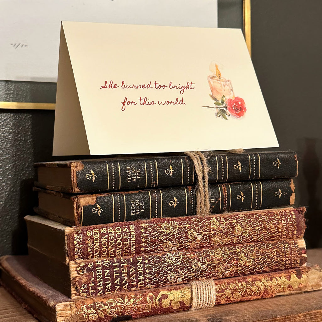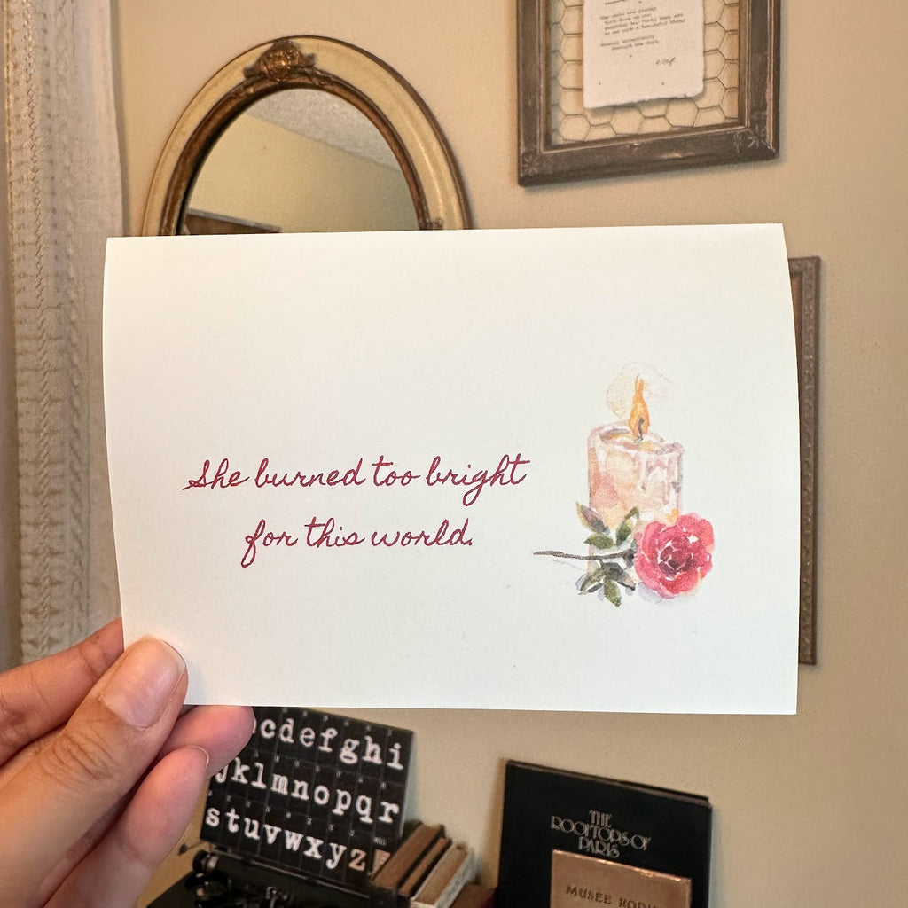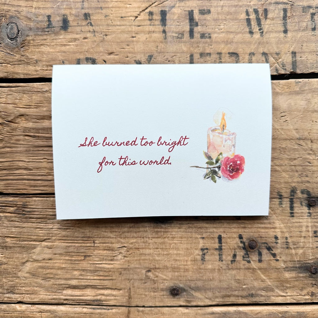 "She burned too bright for this world" quote card with original burning candle and rose watercolor image by artist Patricia Shaw.