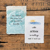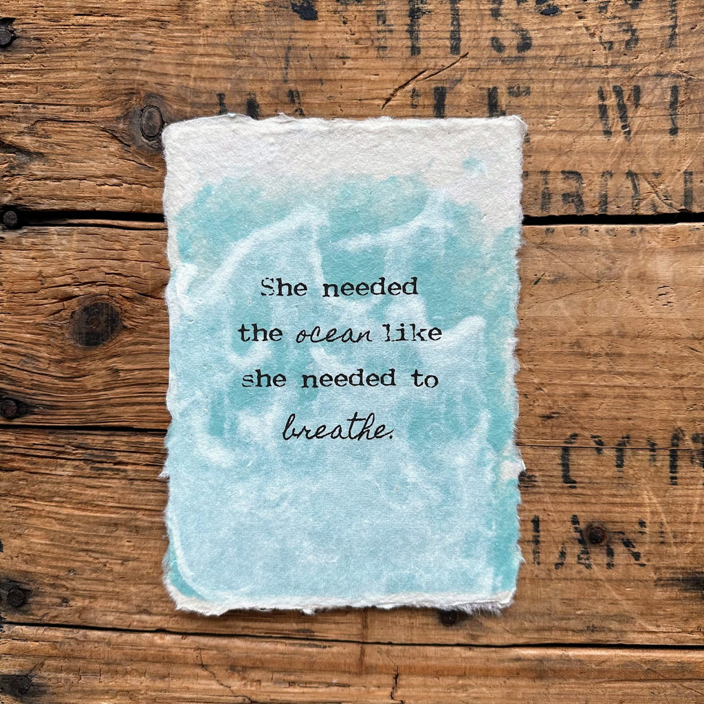 "She needed the ocean like she needed to breathe" quote from author unknown printed on handmade ocean wave paper. The paper is handmade to look like ocean waves and sand. Each sheet is one-of-a-kind, some sheets have more sand color and some have more blue waves.