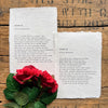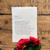The words are printed in a typewriter font on handmade cotton rag paper with deckle edges. The color of the paper is a natural, unbleached white but may occasionally have tiny speckles of random color from other fibers mixed in. Size varies slightly because of the imperfect nature of handmade paper, but will be roughly 5" x 7", 8" x 10", or 11" x 14" based on your selection.