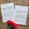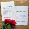 The words are printed in a typewriter font on handmade cotton rag paper. The color of the paper is a natural, unbleached white but may occasionally have tiny speckles of random color from other fibers mixed in. Size varies slightly because of the imperfect nature of handmade paper, but will be roughly 5" x 7", 8" x 10", or 11" x 14" based on your selection.
