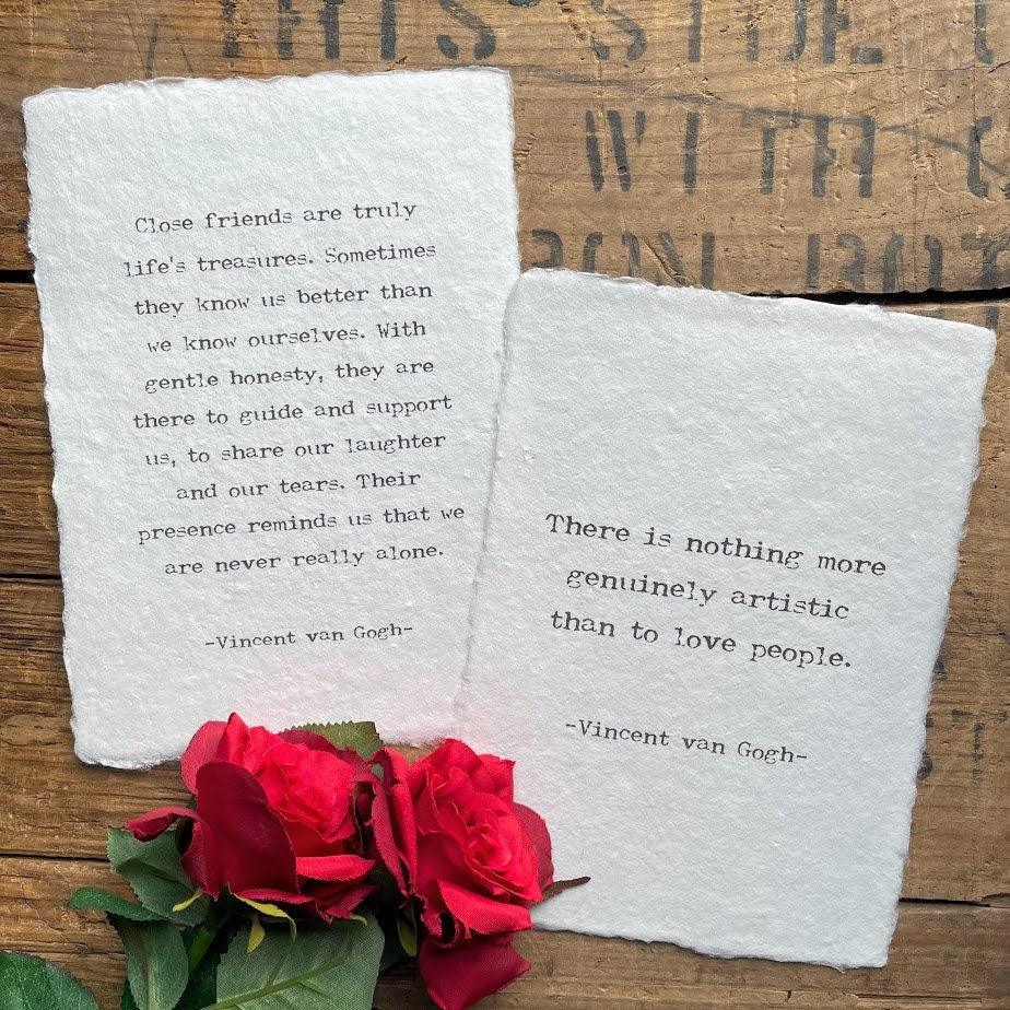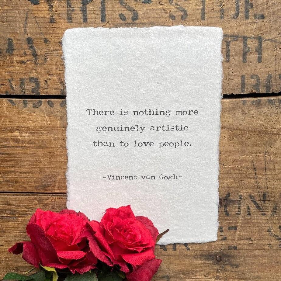 Vincent van Gogh's "There is nothing more genuinely artistic than to love people" quote in typewriter font printed on handmade cotton rag paper.