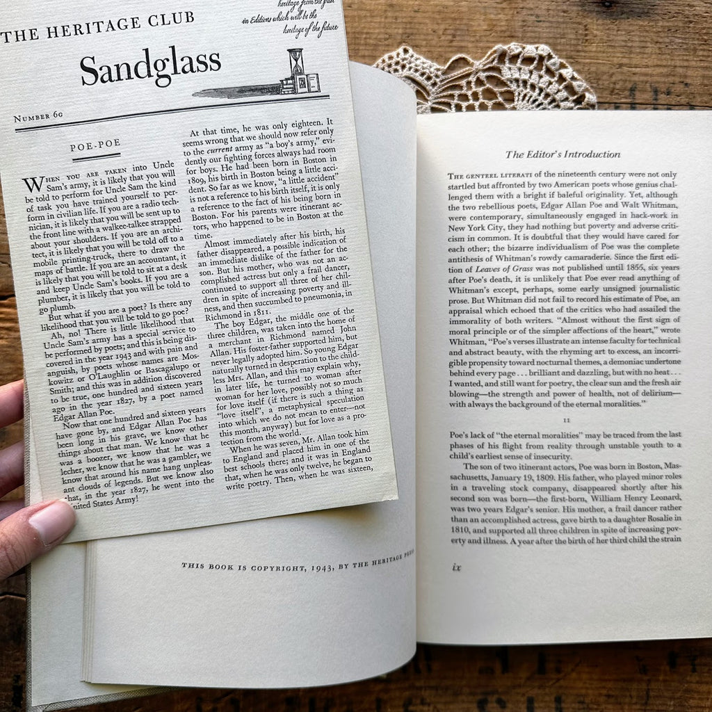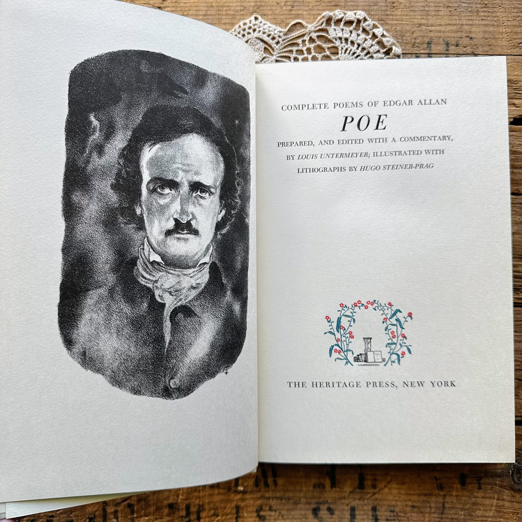 Vintage 1943 Complete Poems of Edgar Allan Poe book, red white and blue American Poets Sandglass Heritage Press edition with blue slipcase. Includes very cool black and white lithographs within.