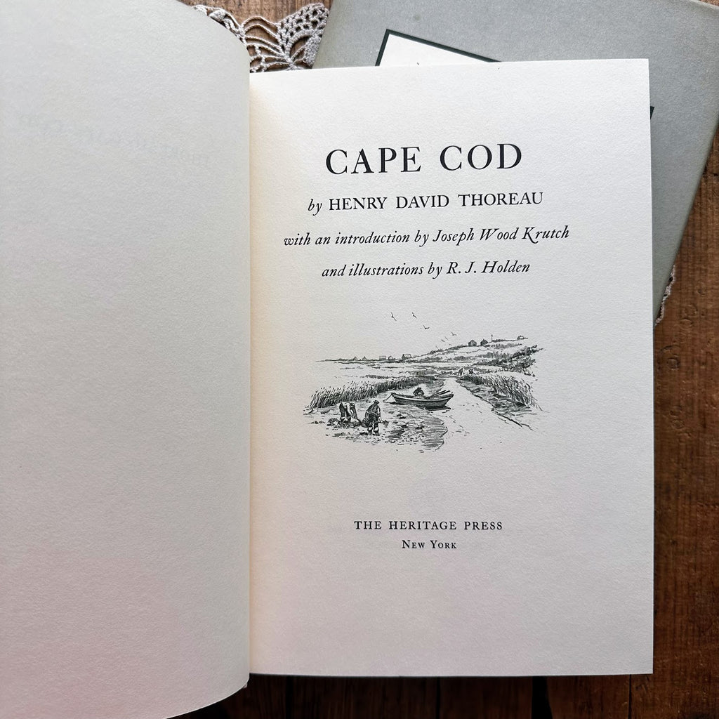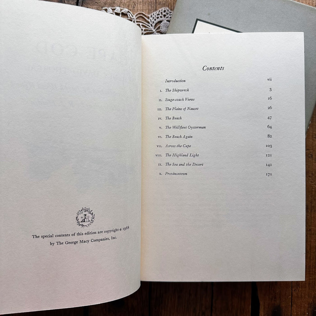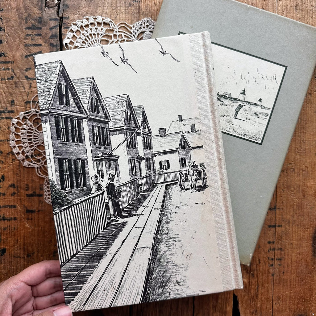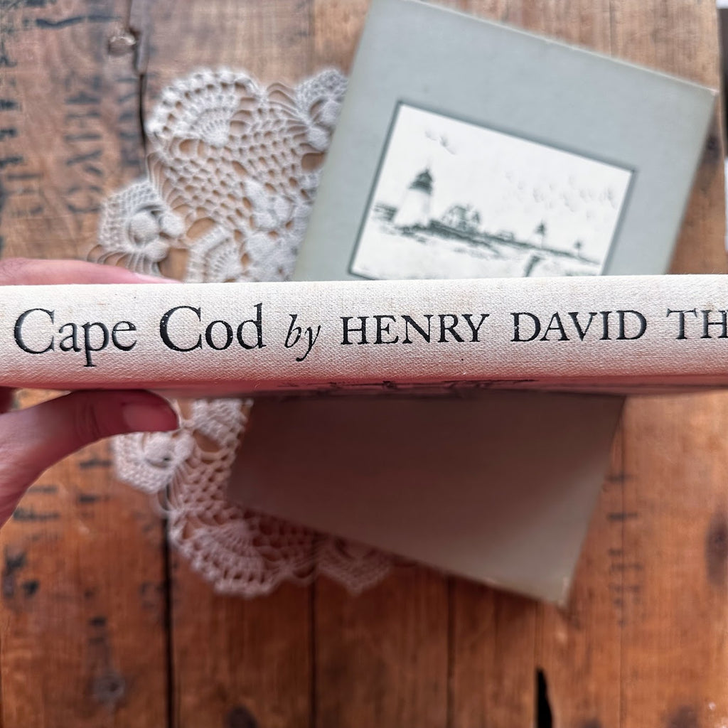 1968 Cape Cod book by Henry David Thoreau. This book has a beautiful green, white, and beige cover showing a beach town with a slip cover showing lighthouses.