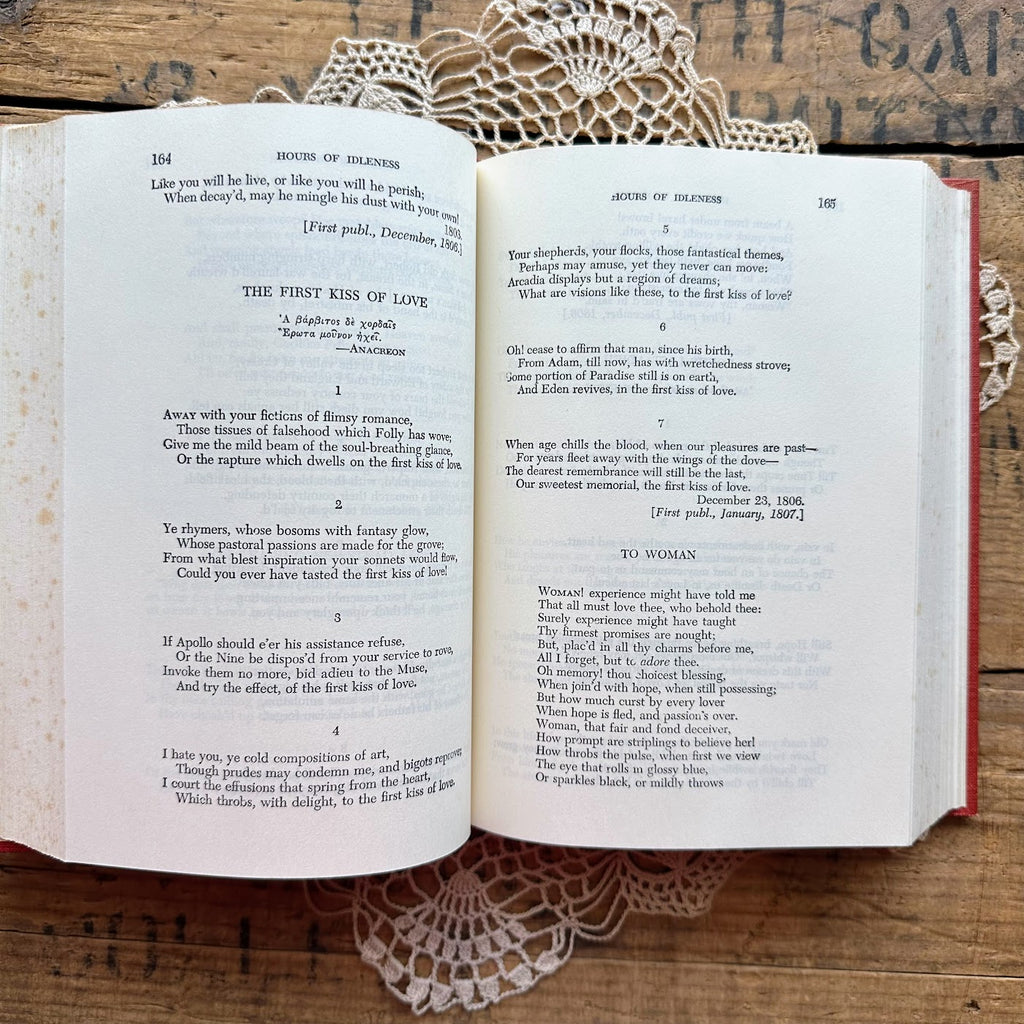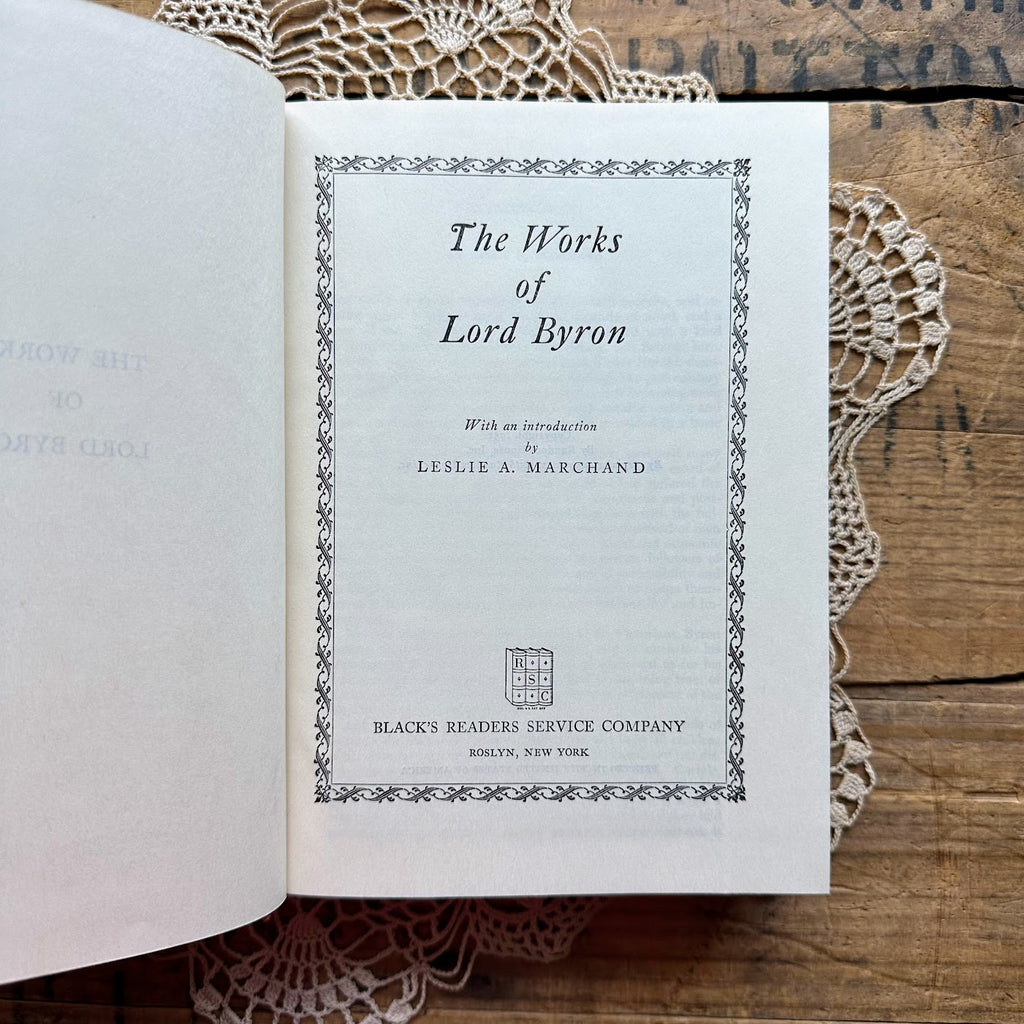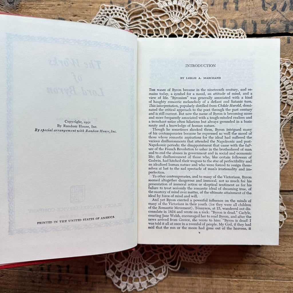 Vintage 1951 The Works of Lord Byron, Black's Readers Edition with a red and gold cover. This book includes a biography and some of Byron's most famous poems, satires, and drama.