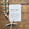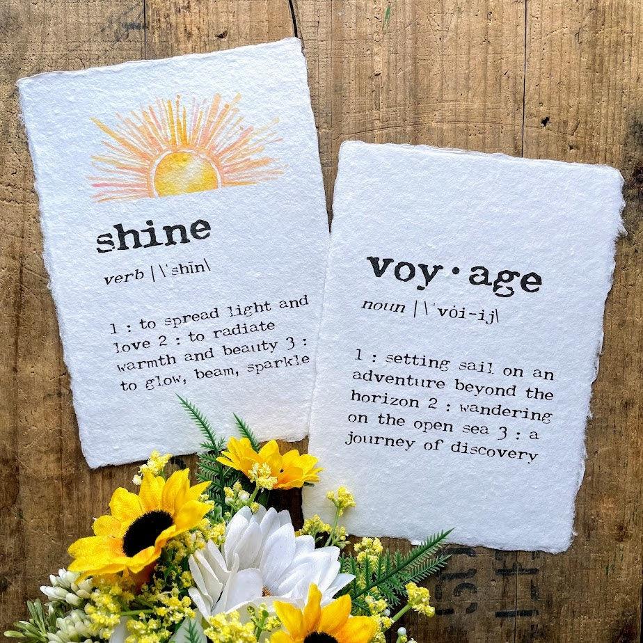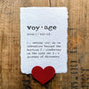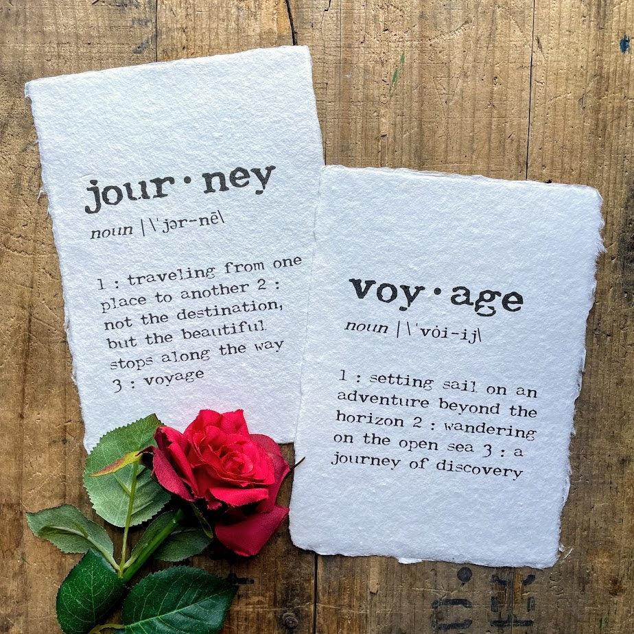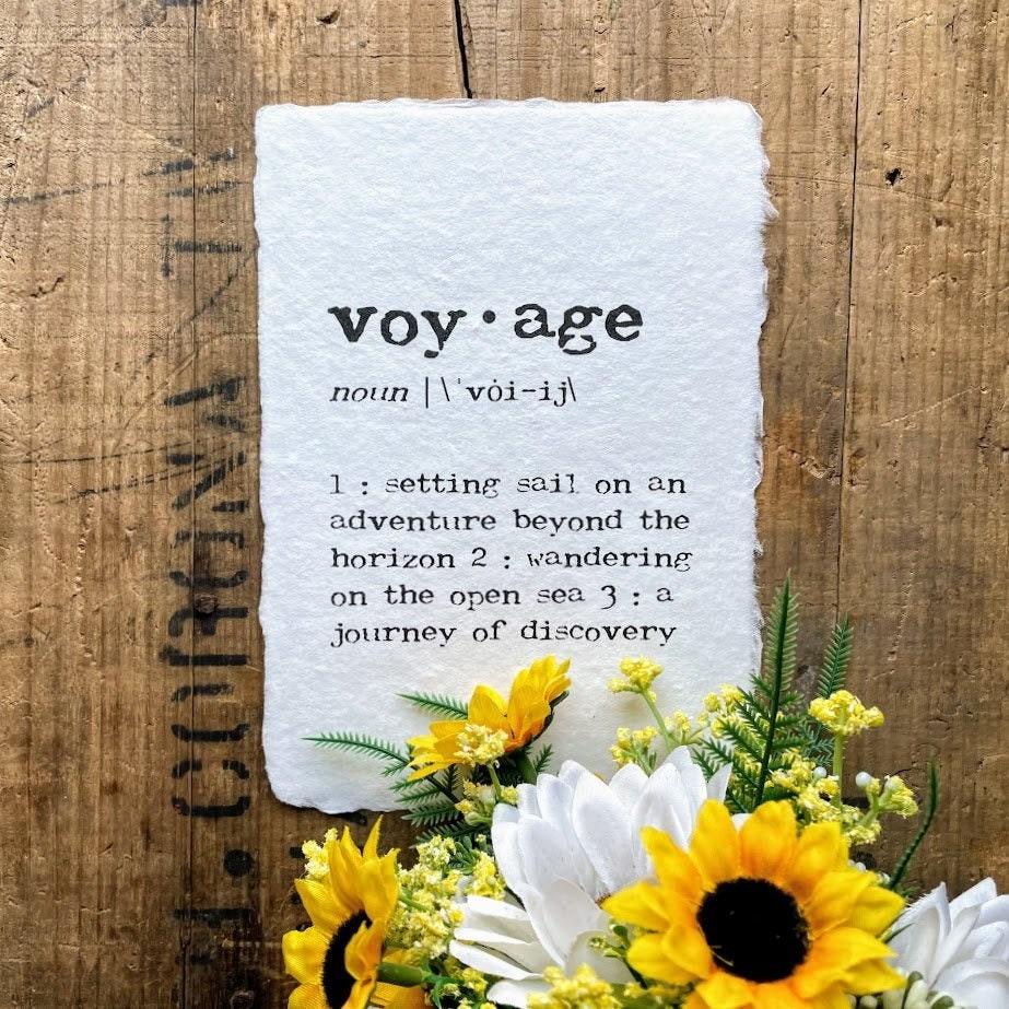 voyage definition print in typewriter font on handmade cotton paper. A voyage is setting sail on an adventure beyond the horizon, wandering on the open sea, and a journey of discovery.