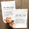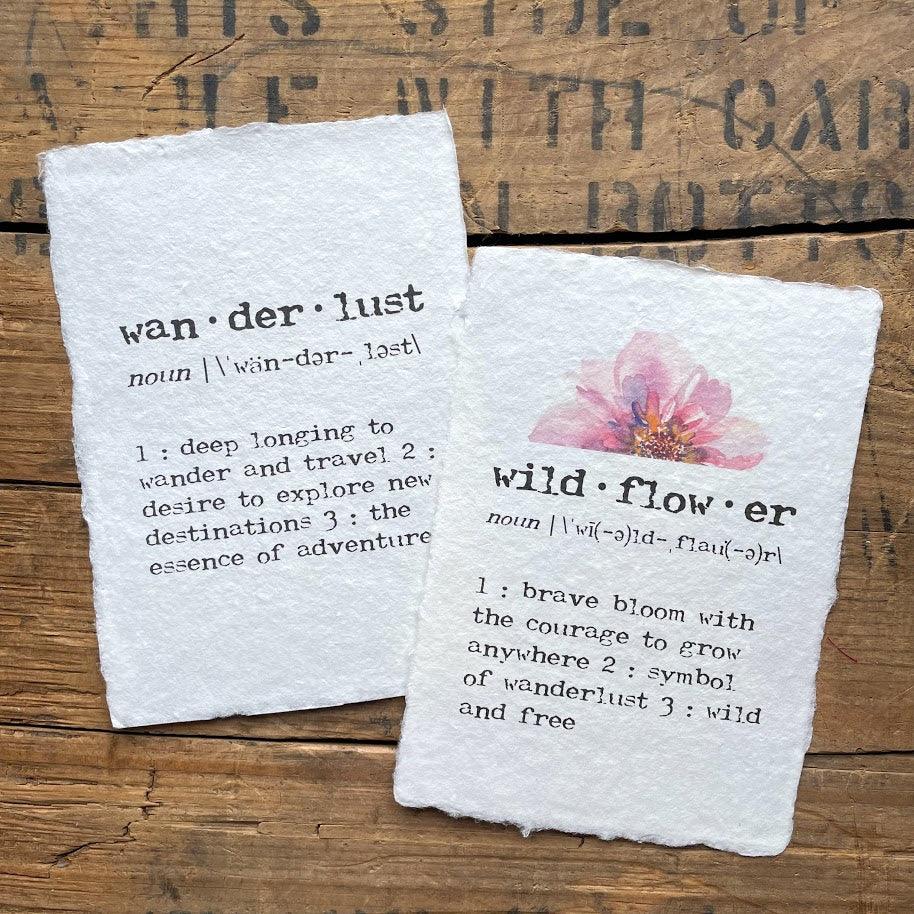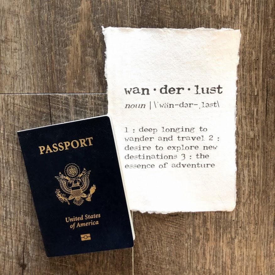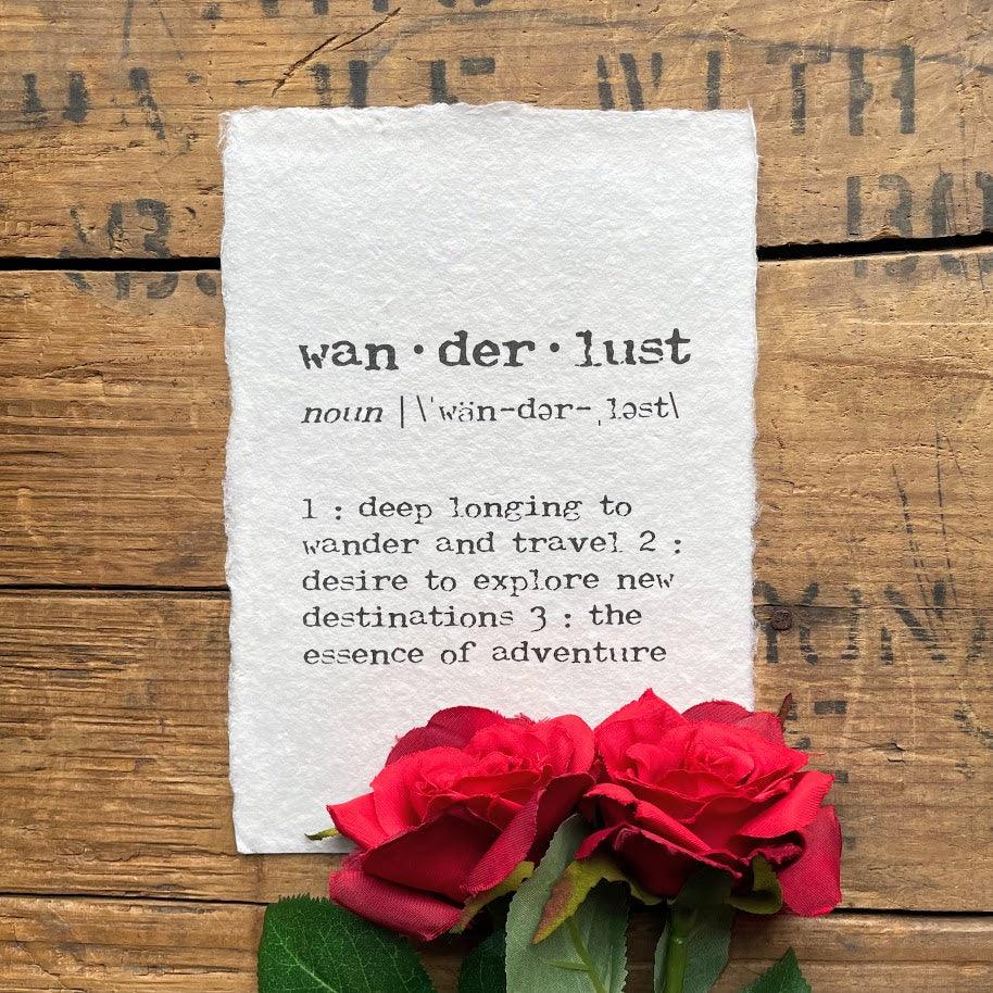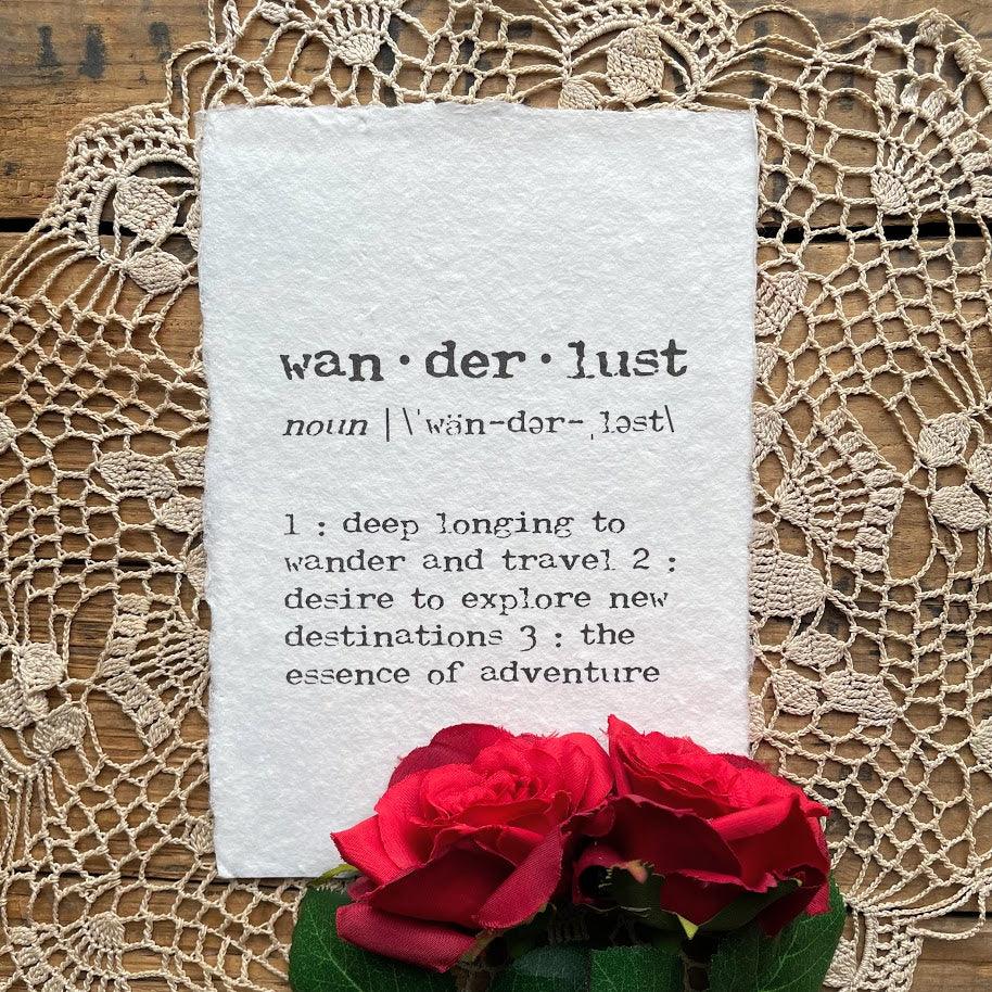 wanderlust definition print in typewriter font on handmade cotton paper. What is wanderlust? A deep longing to wander and travel, desire to explore new destinations, and the essence of adventure.
