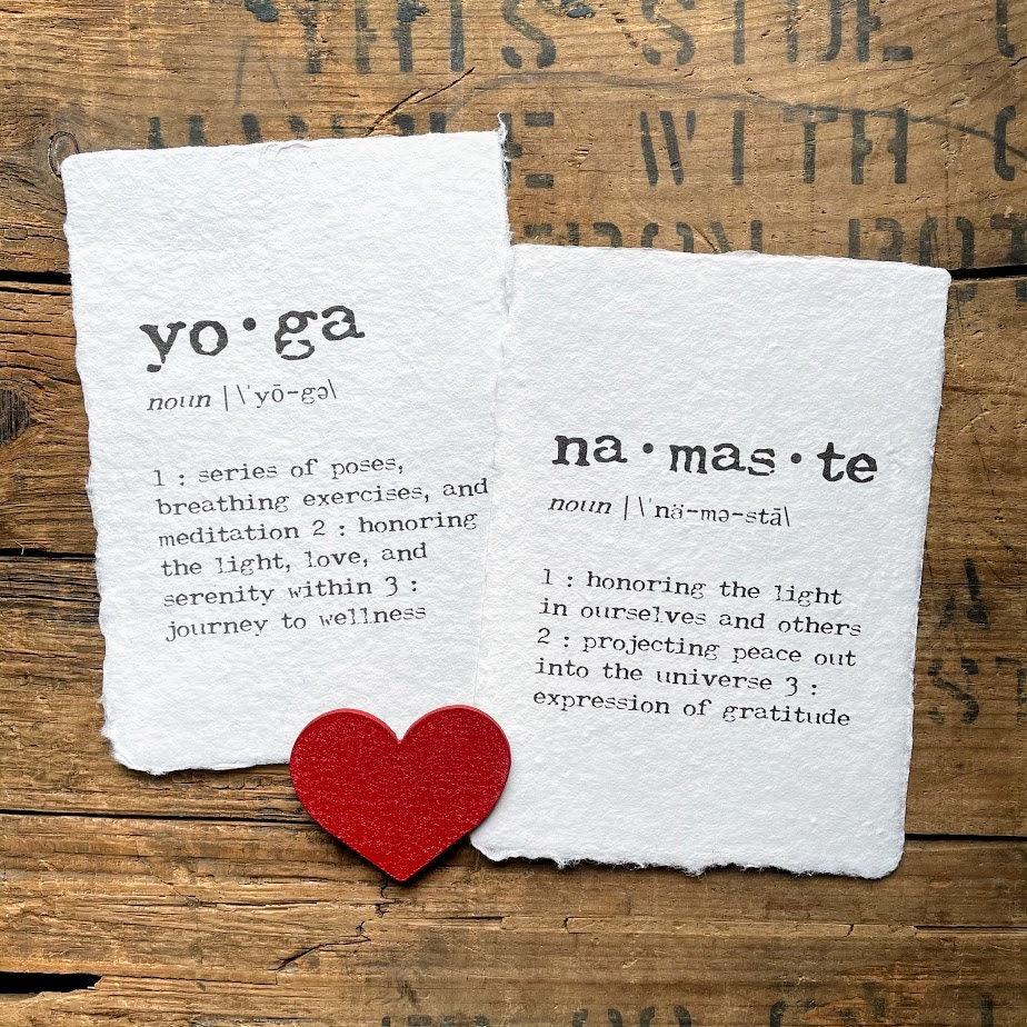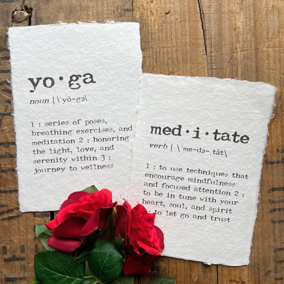 yoga definition print in typewriter font on handmade cotton paper. Yoga allows you to honor the light, love, and serenity within and take a journey to wellness.