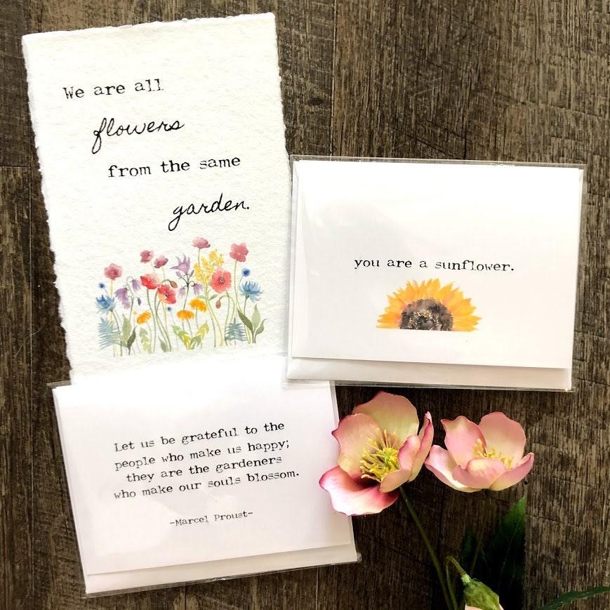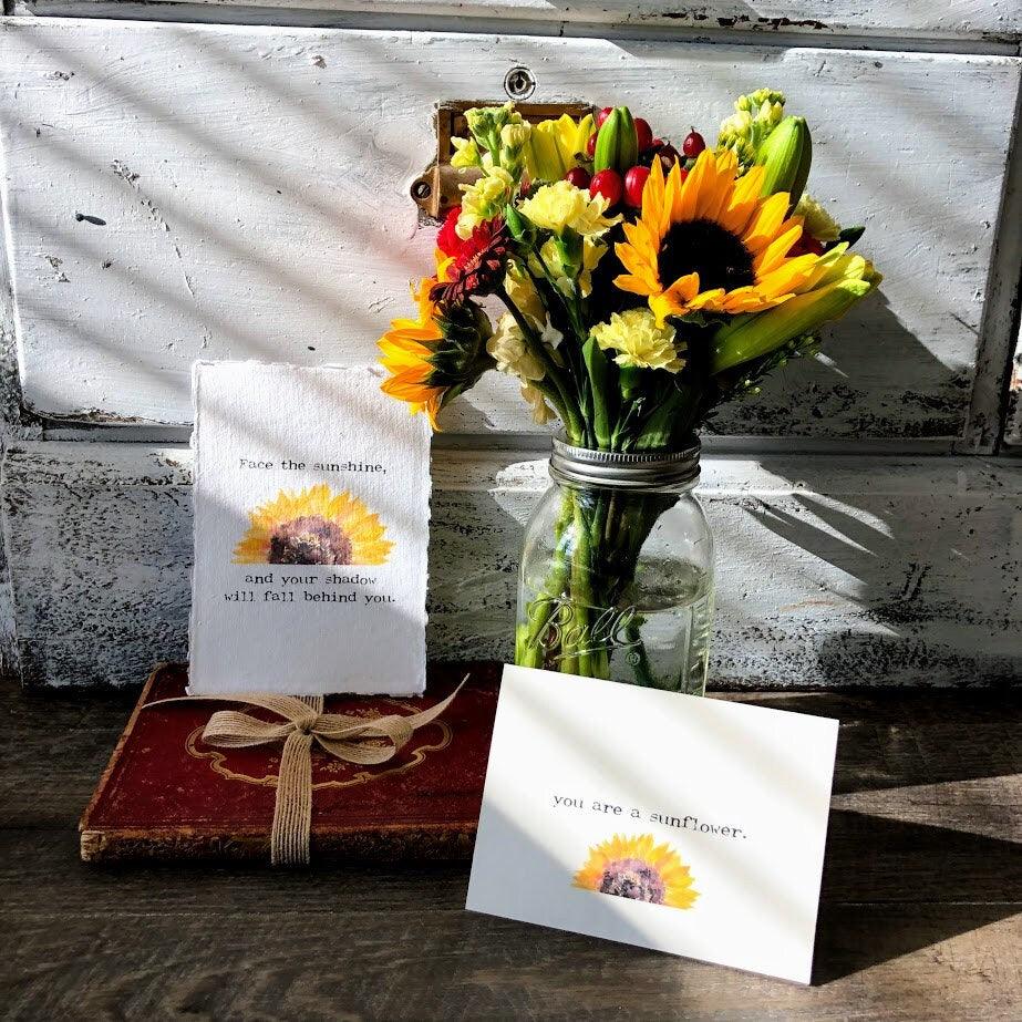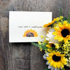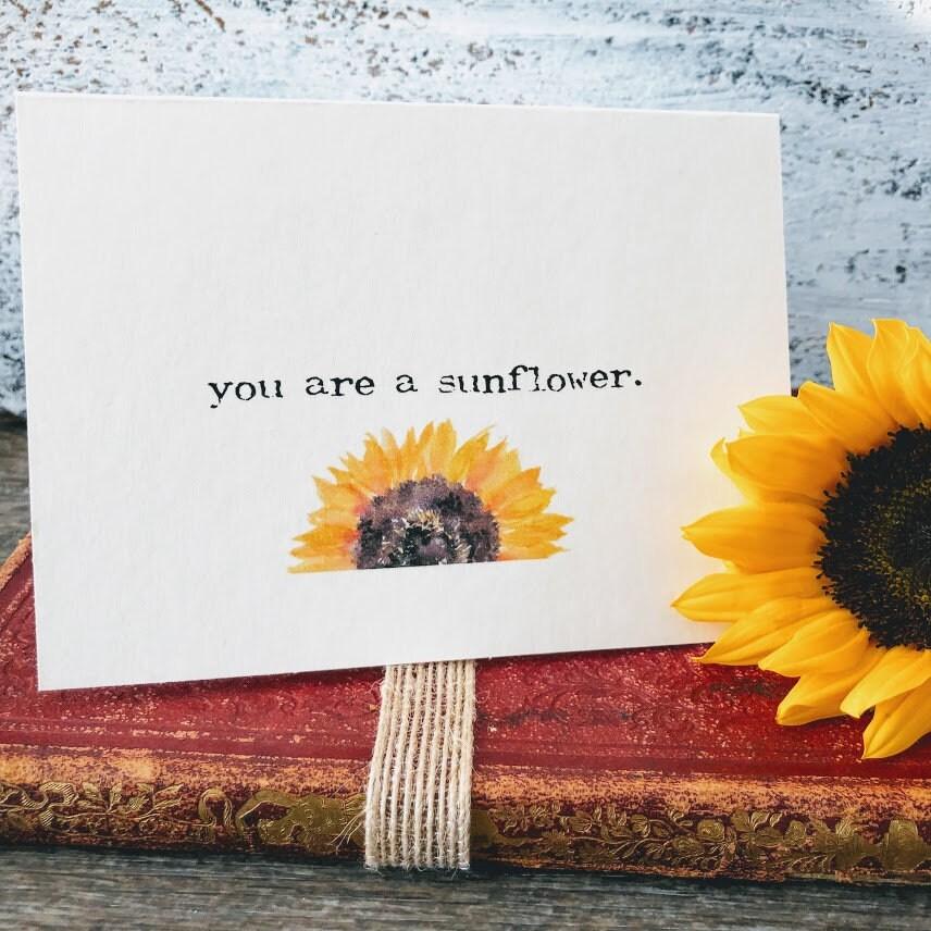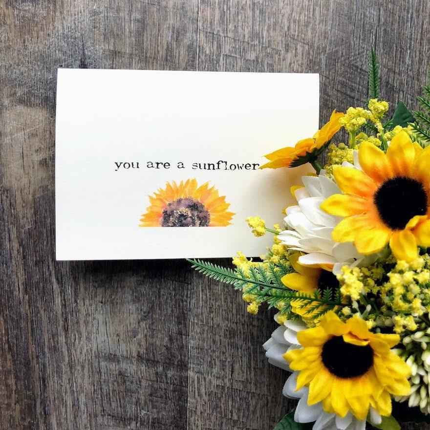 you are a sunflower compliment greeting card in typewriter font with original sunflower watercolor by artist Patricia Shaw.