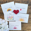 The words are printed in typewriter font on your choice of WHITE, or IVORY cardstock. Size is 4" x 5.5". Corresponding envelopes are included. You will also receive a free Alison Rose Vintage sticker. Just peel the back off and seal your card with a red rose!