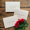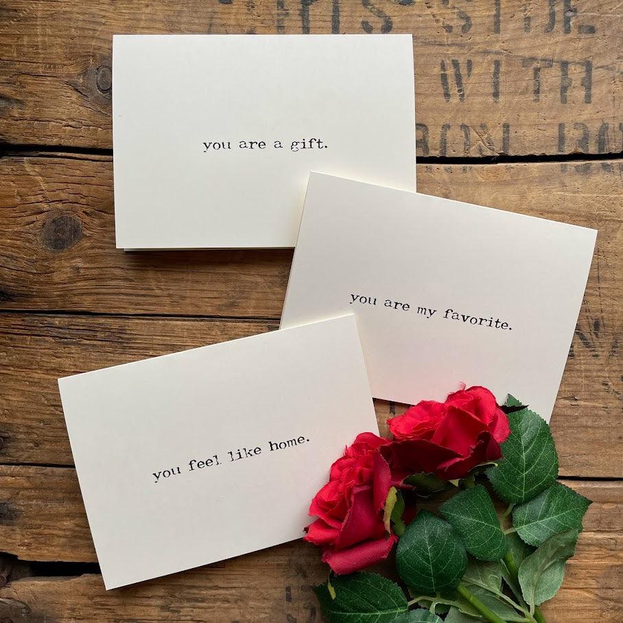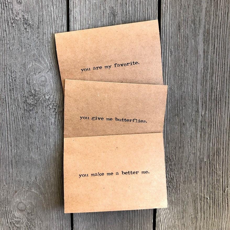 The words are printed in typewriter font on your choice of Kraft BROWN, WHITE, or IVORY cardstock. The kraft brown cardstock is not a flat brown, but has fiber mixed in. Size is 4" x 5.5". Corresponding envelopes are included. You will also receive a free Alison Rose Vintage sticker. Just peel the back off and seal your card with a red rose!