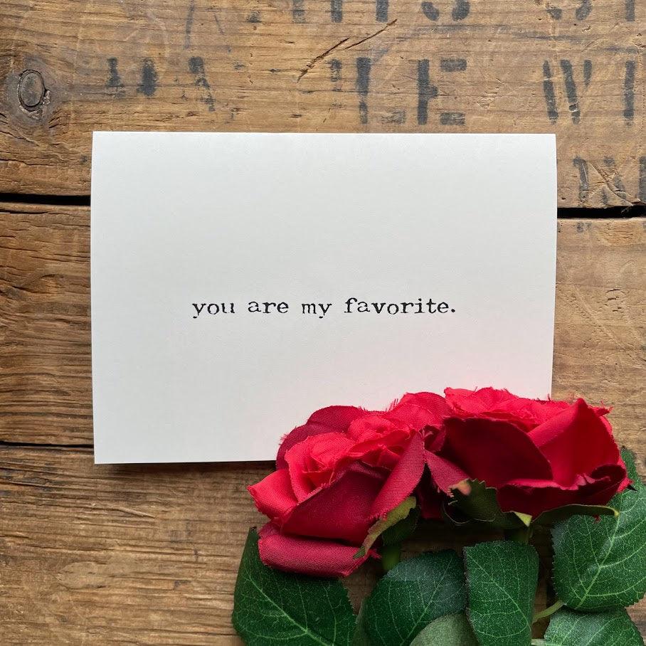 you are my favorite compliment greeting card in typewriter font with envelope and rose sticker.